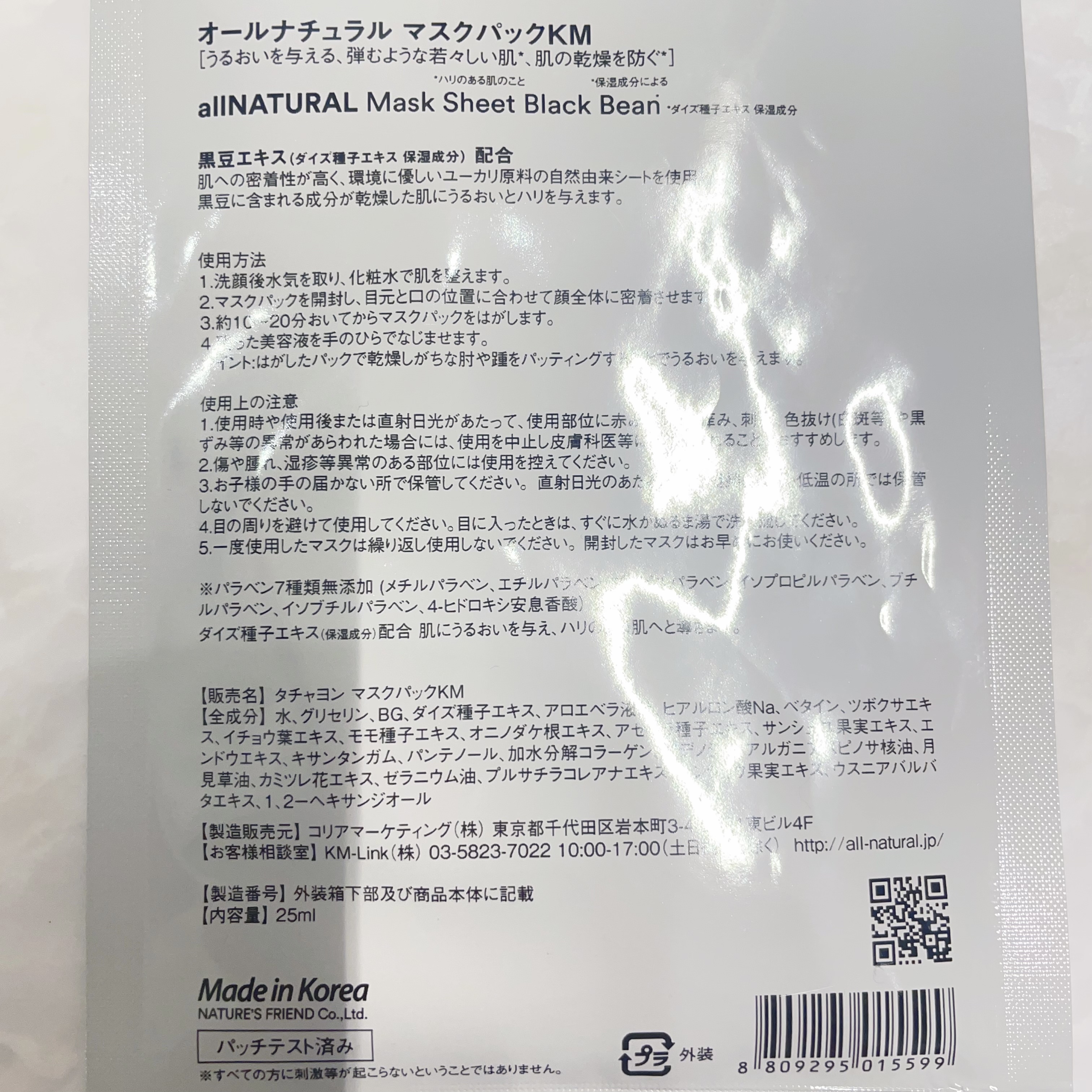 【人気のマスクパック🖤】allNATURAL/オールナチュラル☑︎オールナチュラルマスクパックKM黒豆エキス配合の黒豆マスクパック🖤エッセンスがたっぷり25ml入っていて、シートもしっとりヒタヒタ!シートはガーゼみたいな感じで肌あたり優しくし...