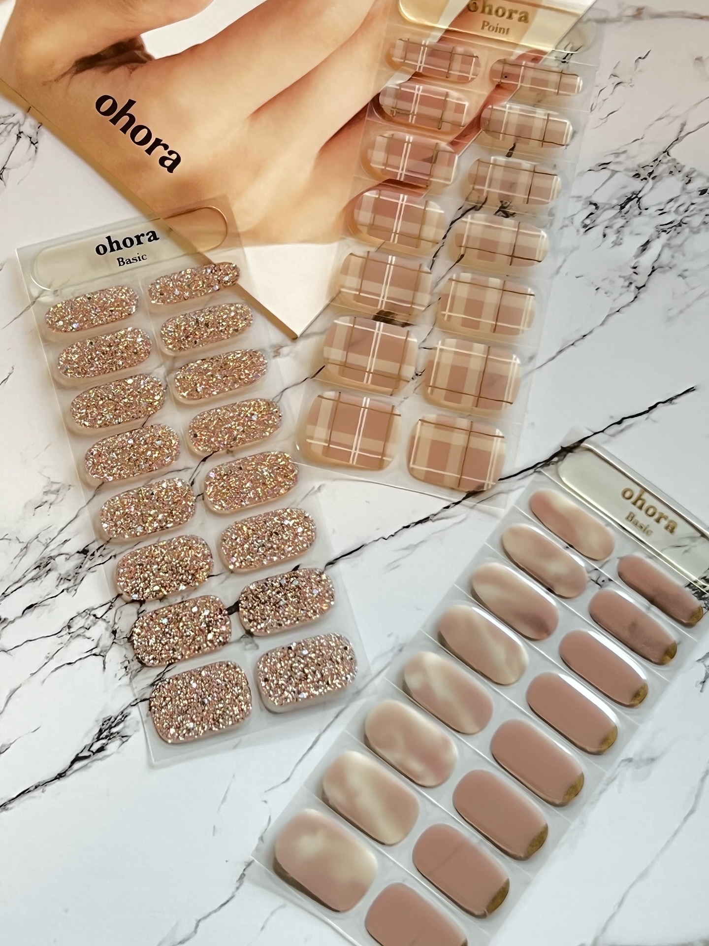 - すべての瞬間を輝かせるグリッターネイル 特別な日におすすめのネイルです。単独でも、組み合わせても使用できるデザインに仕上げました。 ※デザインにより価格が異なります 本物のジェルを60%固めた"セミキュアジェルネイル" 今までになかった新しい形のジェルネイルです。 60%だけ固まった状態のネイルシールなので、柔らかくどんな形の爪にもしっかりフィット。 本物のジェルを使っているため、完全に固めることで、サロンのようなツヤ感と立体感が生まれます。 "好き"が見つかる多彩なデザイン ohora セミキュアジェルネイルは、ベースジェル、カラージェル、トップジェルの3層で構成。 豊富なカラーとラメ、パーツで仕上げた多種多様なデザインはまるで高級サロンのような仕上がりに。