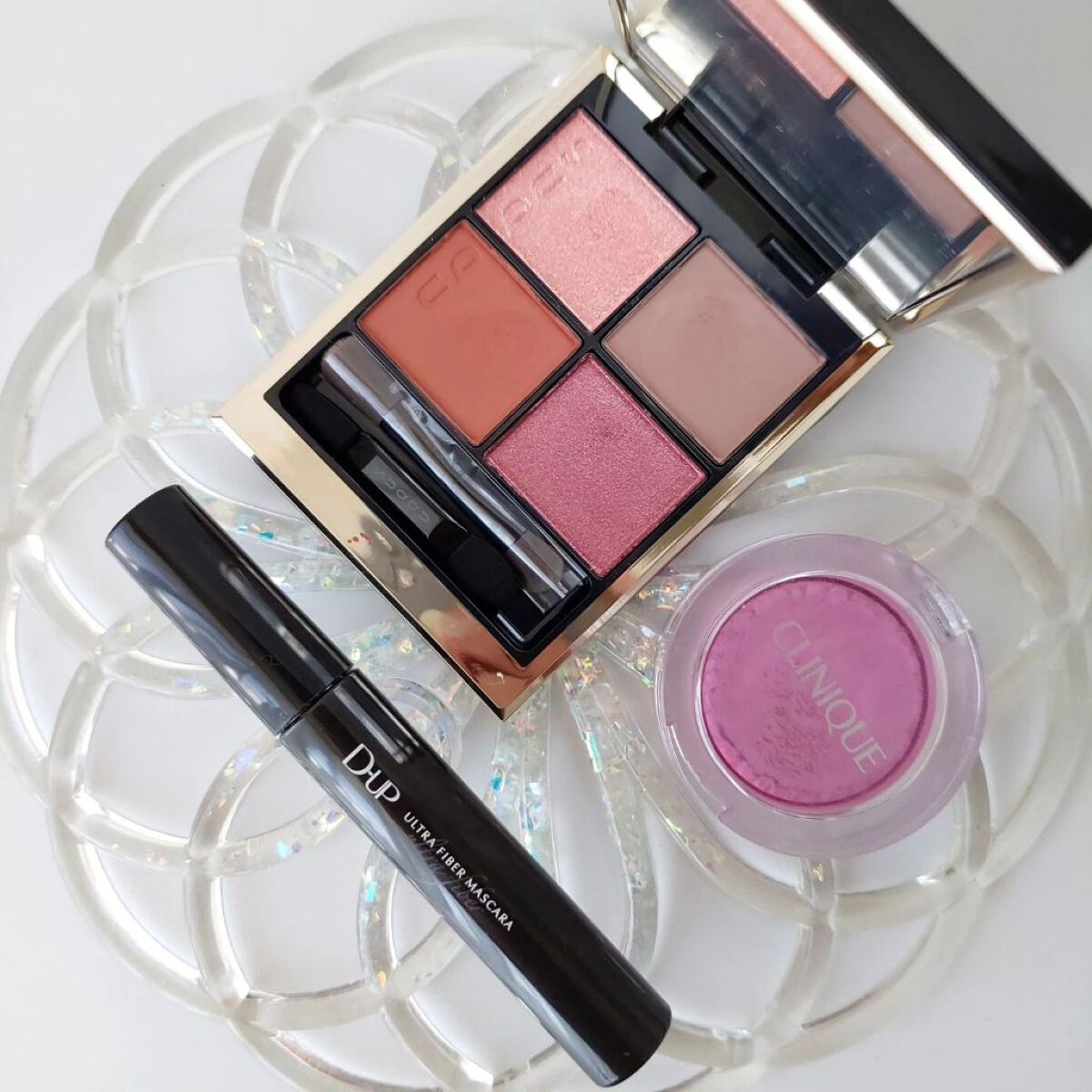 まずはラメ好きにはたまらないアイパレ🌟 これはもう可愛い以外の何者でもないよね!? 全体的にピンク系なので甘めの雰囲気です☺️☁️ 割としっとりめだからラメ飛びも少ないのと、 時間が経っても二重の溝にたまらないのが良かった◎ お次はニューインスパイアコレクションの クリアブラック・マルチフィクサーでまつげの印象UP👁 黒マスカラだと強めになるしクリアマスカラだと物足りない… そんな時にぴったりなクリアブラック😉🖤 最後はアイパレとセットになってるグロス♡ カラーは#rosyglam 🌹 ヌーディーなピンクにゴールドラメがたっぷり🤩 厚みがあるグロスなので気になる縦シワもつるん! ぽってり可愛い唇にしてくれます💖 ほんのりフローラルの香りがするよ。
