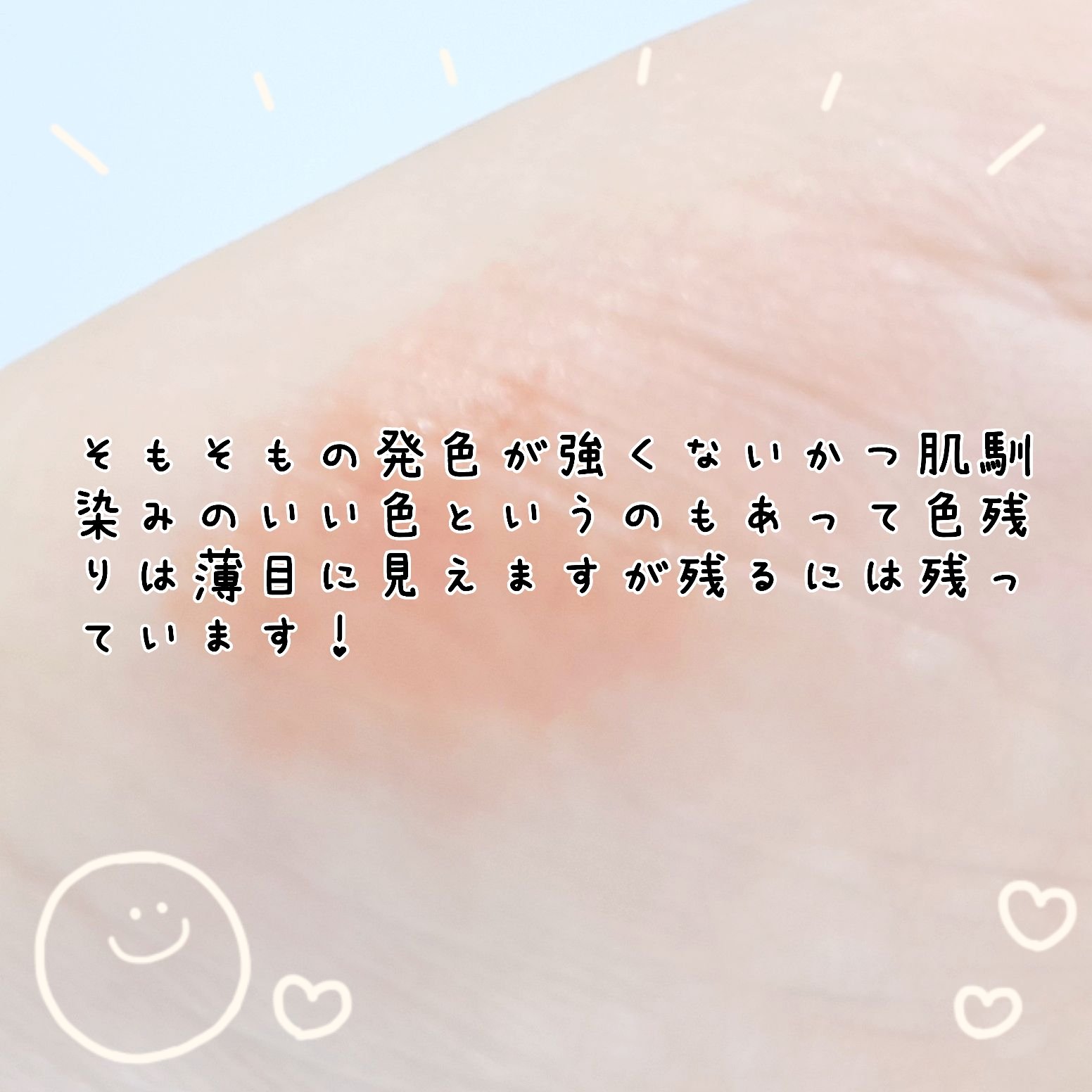 色味はオレンジ系の色味で発色はそこまで強くない。見た目からそのまま薄くしたような色づき 肌馴染みの良い色なのでティッシュオフしたときけっこう消えているように見えますが、実際見るとそれなりに残っています 肌馴染みが良いが故に私の唇上であんまり発色しなかった…!馴染んでしまった…!!