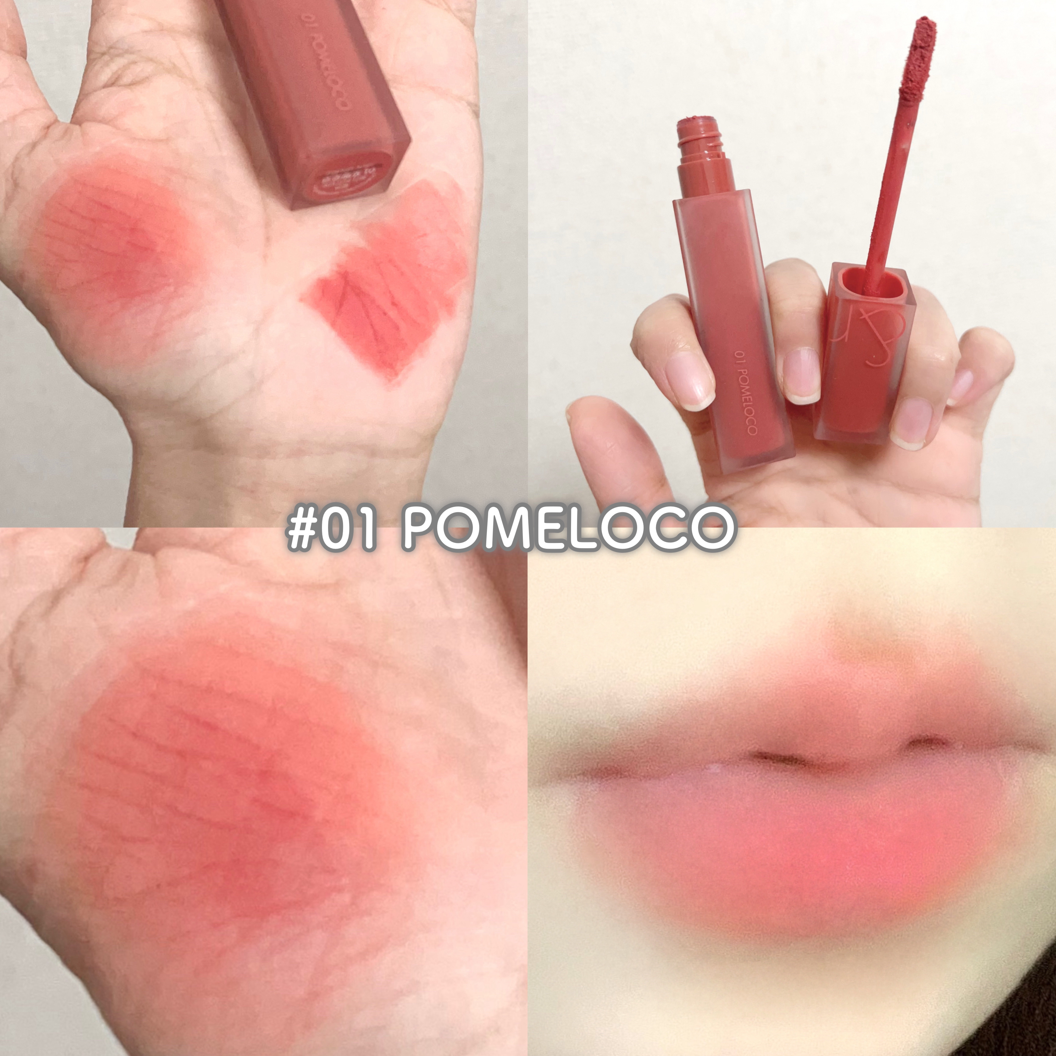 ふわっとしたテクスチャーだから ぼかしやすいです 流行りの輪郭ぼかしリップに向いています💕 ふわふわさらさらのムースみたいで 乾燥する感じは全くなく、 マットが好きじゃない人、苦手な人にも気に入ってもらえそうな質感だと思う💖✨ このリップは韓国の人気YouTuberのminscoさんと開発されたカラーが何色かあるそうで、なかでもこの #01 POMELOCOはその1つです💫 こだわり抜かれたカラーと質感でとりあえずの一本目は #01 POMELOCOで正解でした🫶🏻