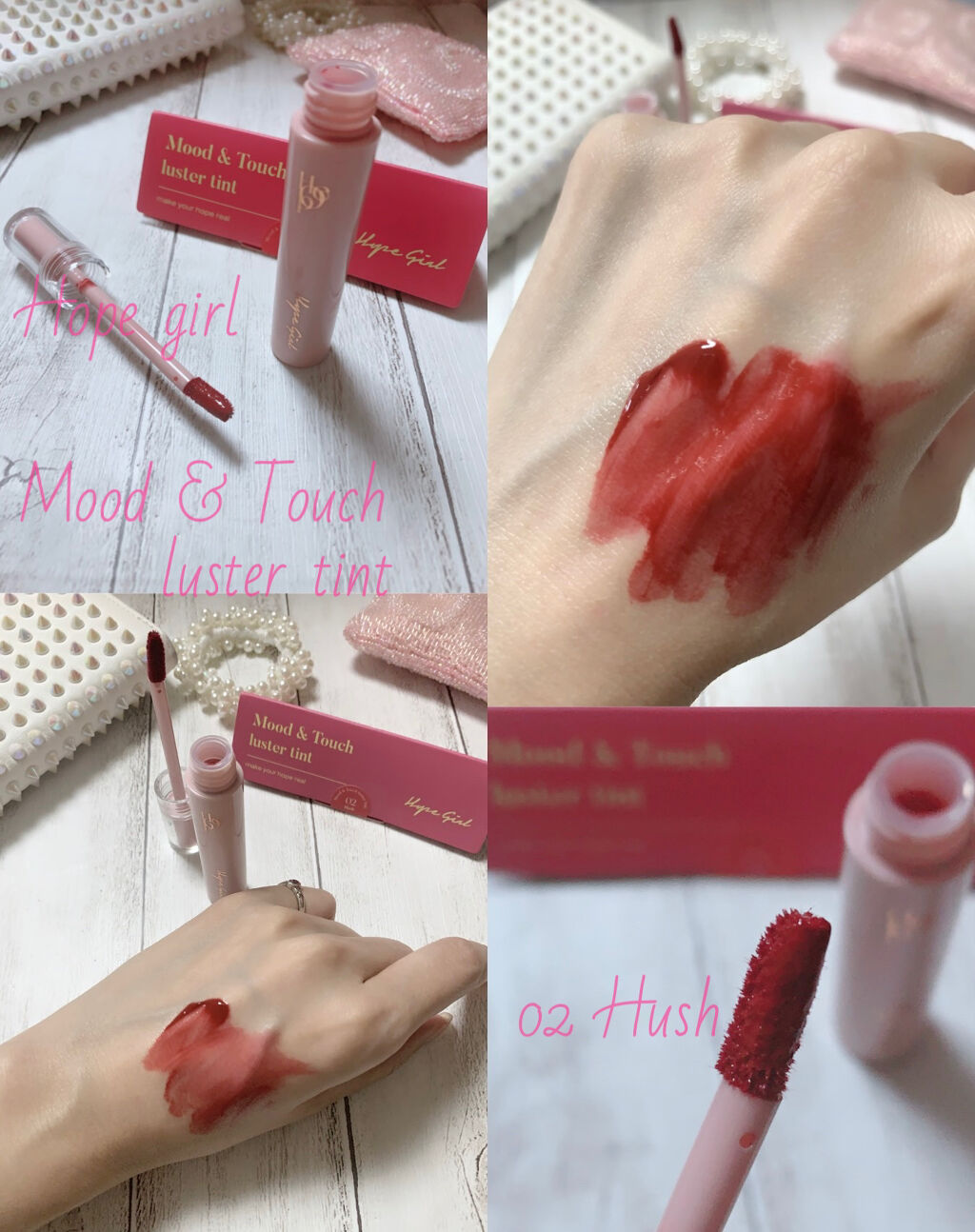 #sponsored#リールもみてね..HopeGirlムードアンドタッチラスターティントカラーは4色展開02Hush 使ってみたよピンクコーラルにダークレットを混ぜたラディッシュローズもう、綺麗なお色こういう色すき箱かわいいーリップ本体もか...