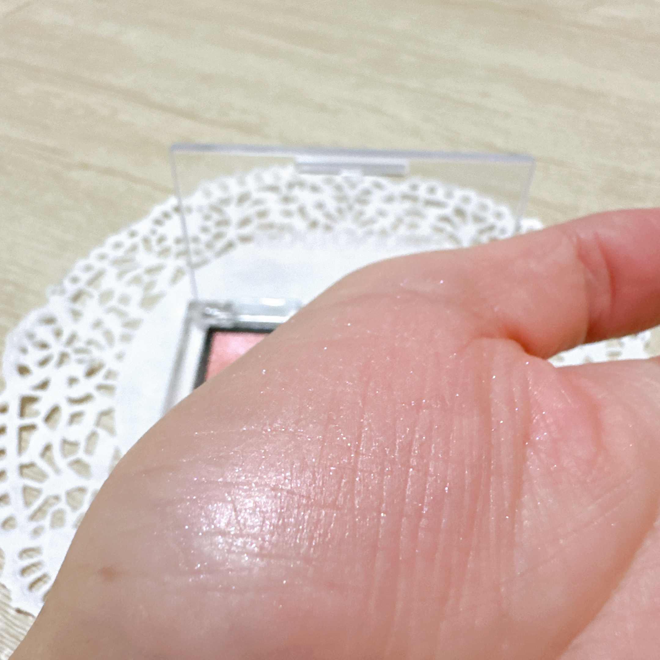 本来はチークの上に乗せてニュアンスチェンジするアイテムなのですが 単品で色みも出る ラメがたくさん パールではなくラメなのでだいぶ目立ちます😂✨ ベースの黄みとラメの青みがなんとも不思議なチーク!!! 自然光だとラメがかなり見えるので室内で過ごす日に使うといいかも!