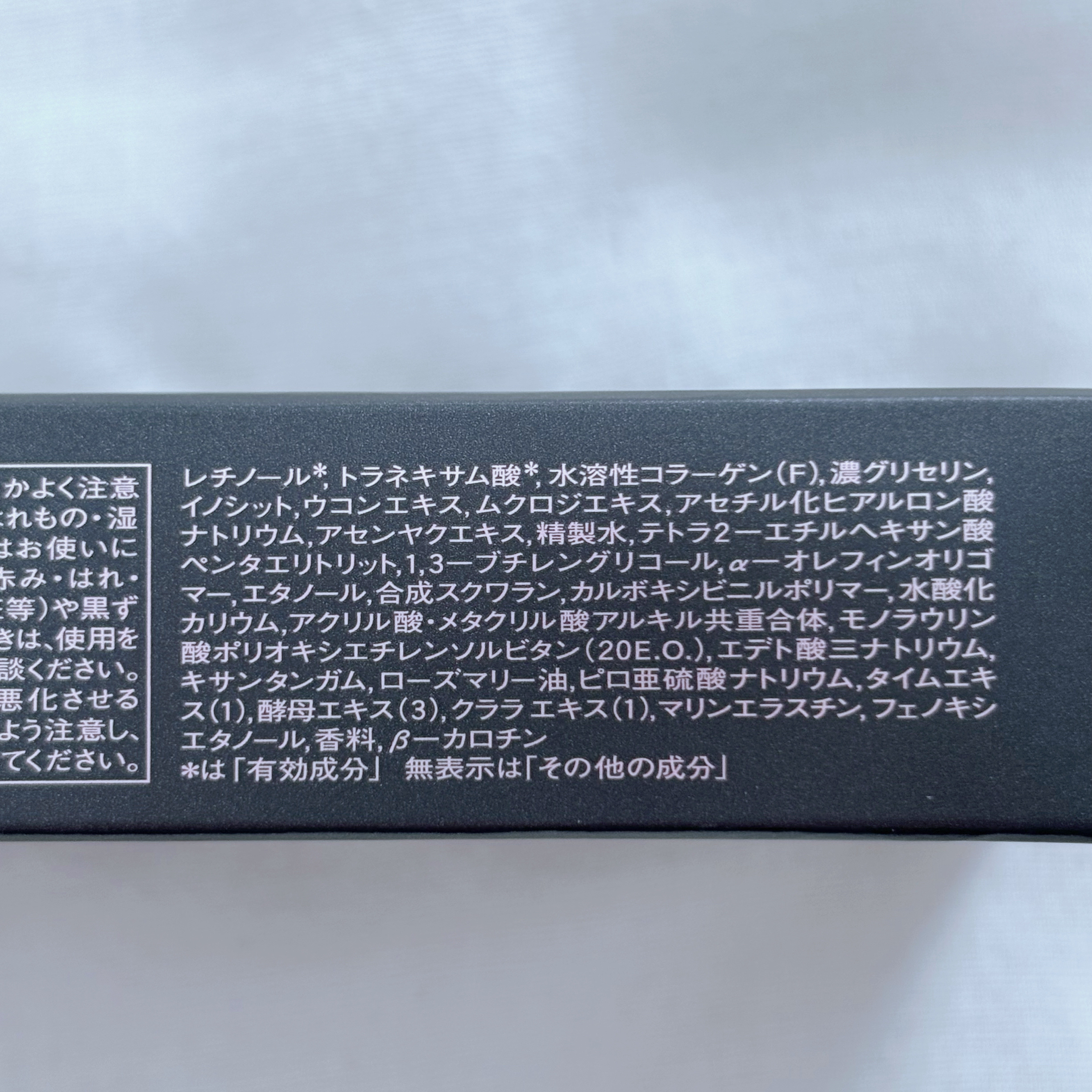 - 有効成分 レチノール、トラネキサム酸 その他の成分 水溶性コラーゲン(F)、濃グリセリン、イノシット、ウコンエキス、ムクロジエキス、アセチル化ヒアルロン酸ナトリウム、アセンヤクエキス、精製水、テトラ2-エチルヘキサン酸ペンタエリトリット、1,3-ブチレングリコール、α-オレフィンオリゴマー、エタノール、合成スクワラン、カルボキシビニルポリマー、水酸化カリウム、アクリル酸・メタクリル酸アルキル共重合体、モノラウリン酸ポリオキシエチレンソルビタン(20E.O.)、エデト酸三ナトリウム、キサンタンガム、ローズマリー油、ピロ亜硫酸ナトリウム、タイムエキス(1)、酵母エキス(3)、クララエキス(1)、ブリエラスチン、フェノキシエタノール、香料、β-カロチン