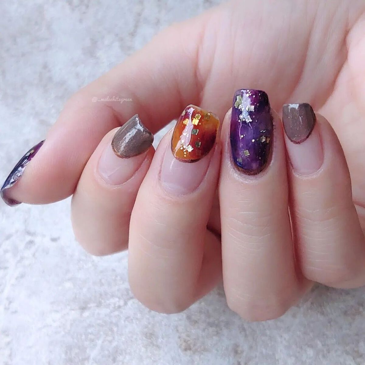 べっこう&紫べっこう今月もIGの紫式部会に参加するべくネイルしました。今月は紫鼈甲がテーマとのことで普通のべっこうの色の濃い部分に紫を使いたいな~と思っていたのですが…あれ?解釈違いだった??ってことに気付きまして、慌てて紫べっこう(っぽいもの)を追加しました。当初のイメージ通り、オレンジのべっこうの一番濃い部分は紫です。マンダリンシロップ→KAEDE&アナスイの紫→ラメ→マンゴーシロップ→アナスイ→ラメ。紫べっこうはアナスイ&バイナラクス→ラメ→ディープスカイ→ラメで作りました。全体を引き締めたくて、セピアフィルムで変形丸フレンチ(ってほど変形じゃないけど)のアウトラインと全面べっこうの根本ラインを描いています。<使ったもの>ColorClub・D271TroutOfThisWorld《マンダリンシロップ》・D273OverAchiever《KAEDE》・D281DeepFreeze《DeepSky》・D290ForceOfNature《SepiaFilm》・D240WishListCND・バイナラクス110DarkLavaANNASUI・ミニネイルカラーN204ORBIS・ベース&トップグロスコートスパークルゴールドORLY・タフクッキーSeche・セシェヴィートToneDrop・SpeedGloss