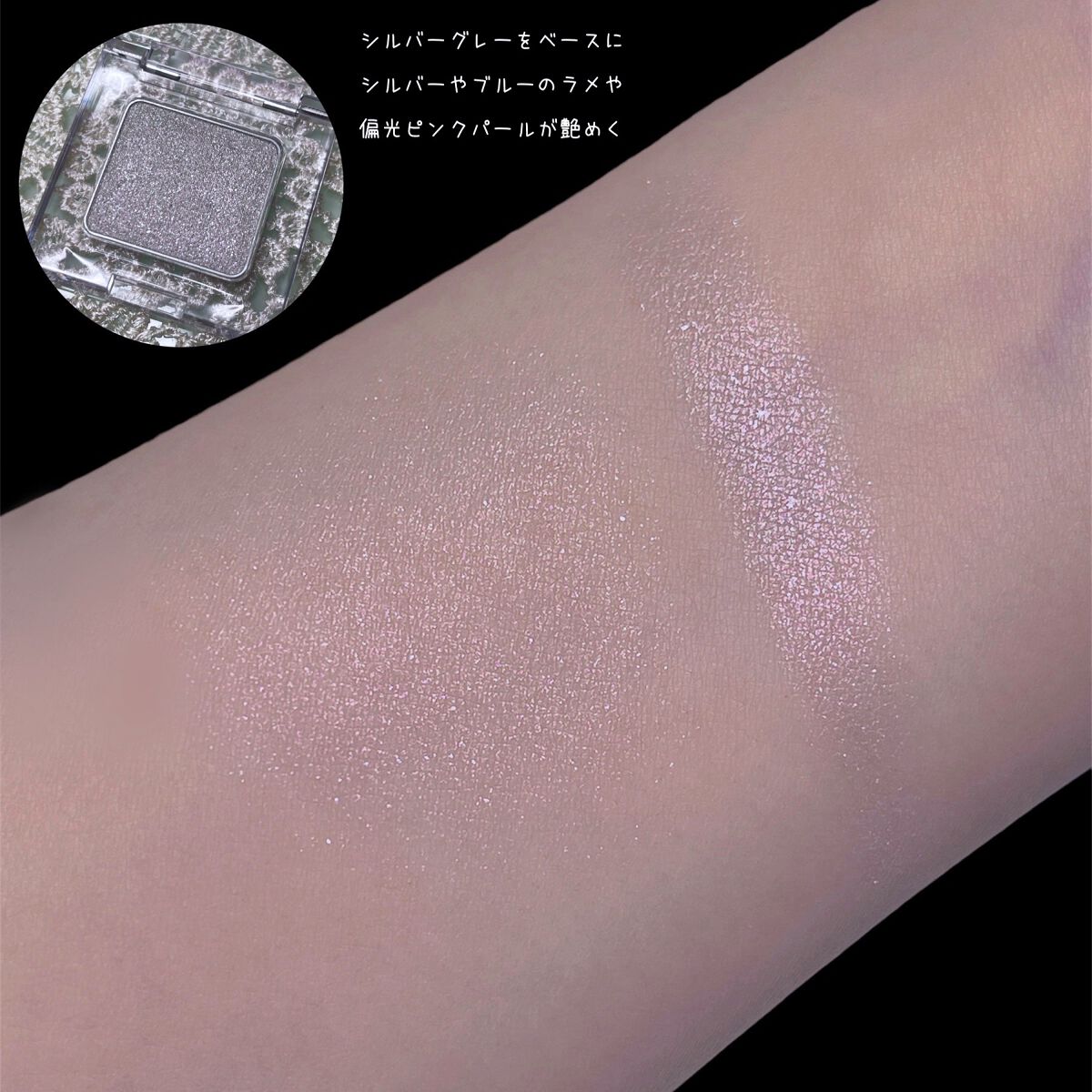涼しげなシルバーグレーのベースに存在感のある大粒のシルバーパールと繊細なピンクの偏光パールたっぷりのアイシャドウ。 手持ちのアイシャドウのニュアンスチェンジや引き算メイクにも◎ ブルベにイチオシ♡