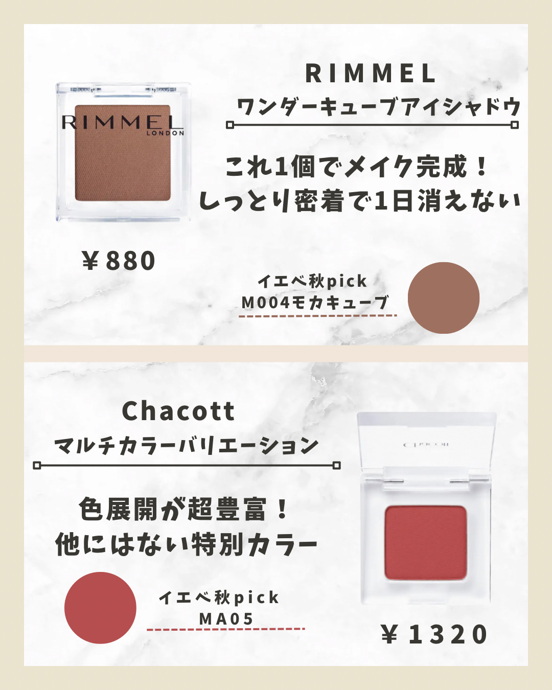 人気の単色・マットアイシャドウを紹介!こんな人にオススメ!・ラメが似合わない…・マットな仕上がりが好み!・多色パレットを使いこなせない…・出先でお直しがしたい…マットな仕上がりが似合いやすいパーソナルカラーイエベ秋の方々のために私のお気に入りカラーをイエベ秋pickとして紹介しています!話題のモカムースメイクにも!是非チェックしてみてください!#韓国コスメ#プチプラコスメ#プチプラ#Qoo10メガ割#コスメレビュー#Qoo10#コスメ#アイシャドウ#アイメイク#イエベ秋#単色アイシャドウ#シングルアイシャドウ#マットアイシャドウ#マット#コスメ紹介#モカムースメイク#単色シャドウ#アデクション#アディクション#ADDICTION#LAKA#イニスフリー#Innisfree#デイジーク#desique#RIMMEL#リンメル#rinmel#チャコット#Chacott