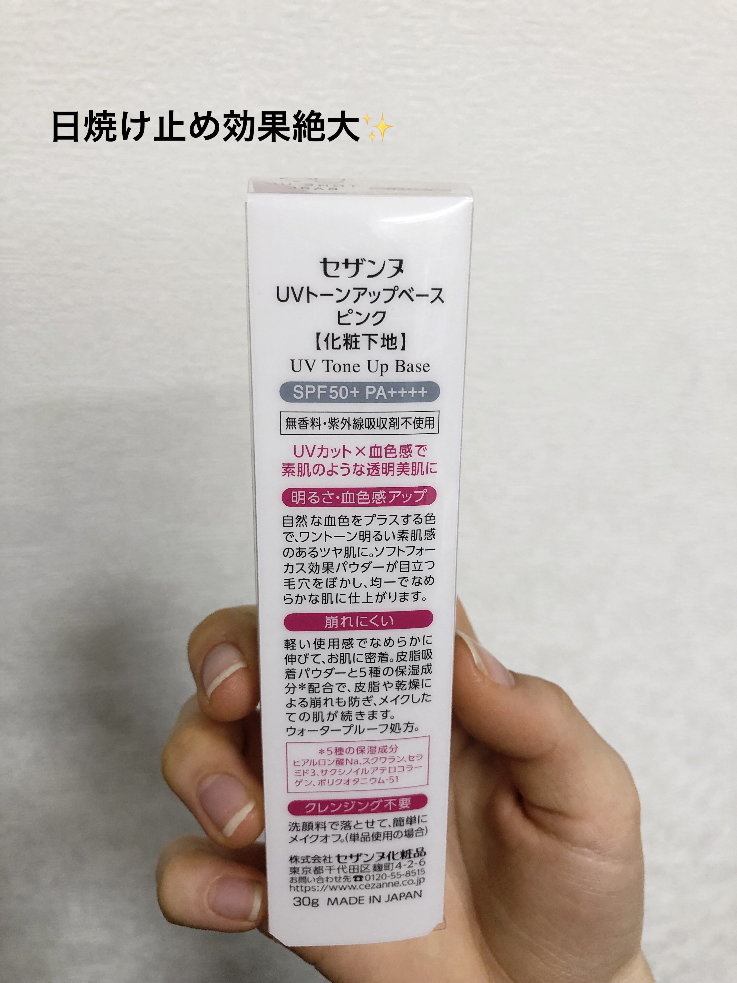 CEZANNE UVトーンアップベース 肌に塗った瞬間から自然なツヤ♡♡ みずみずしい健康的なツヤ肌にしてくれます♡ このピンクの色味が絶妙で、肌なじみ抜群! ソフトフォーカス効果パウダー配合で、気になる毛穴も自然にぼかしてくれる優れもの♡♡ SPF50+/PA++++と紫外線対策もバッチリ! 水・汗・皮脂に崩れにくい、ウォータープルーフ処方なので、真夏も安心して使えます。 このクオリティでこの価格は本当に素晴らしすぎる♡♡ 全ての方におすすめしたい化粧下地です♡♡