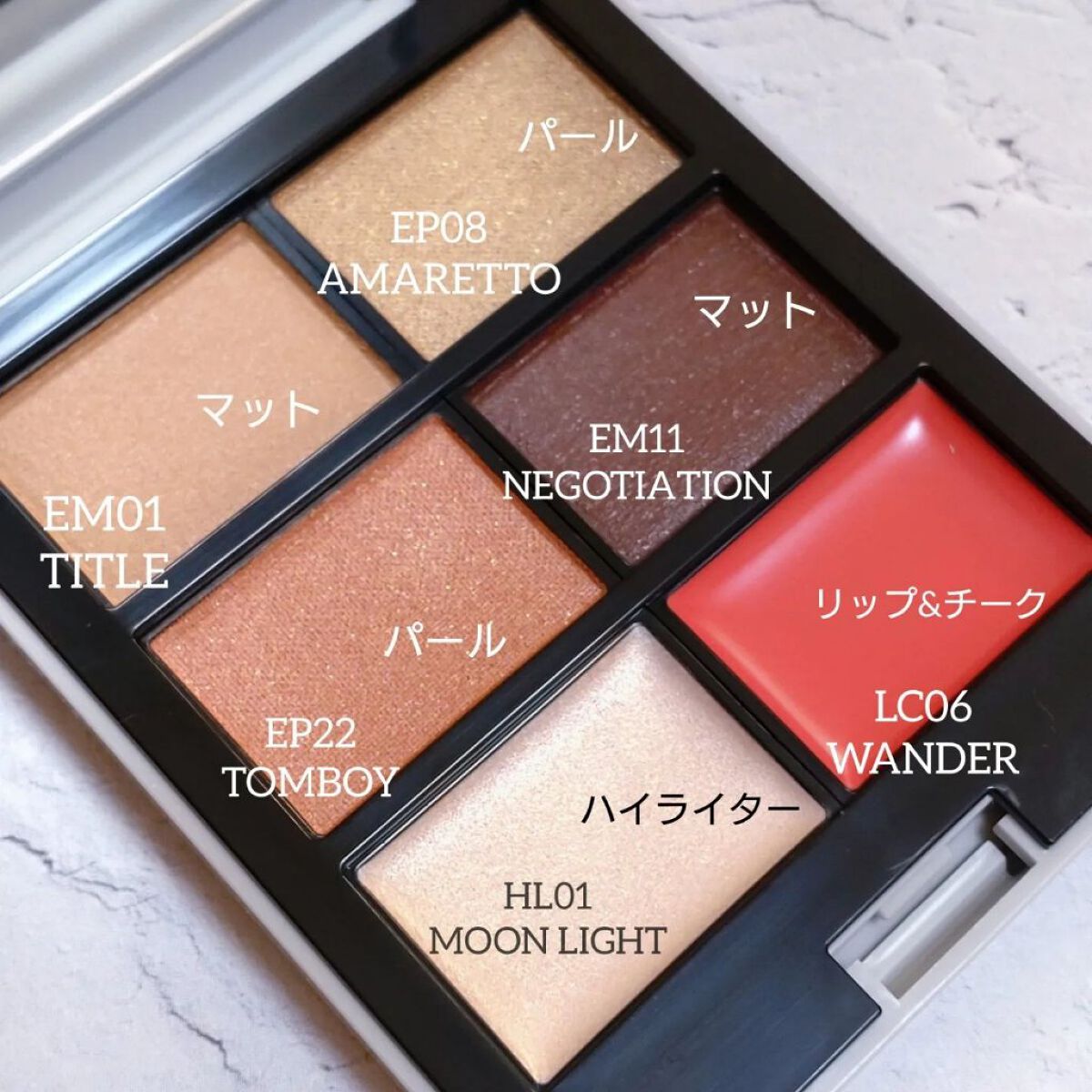 MNMYMIXEDPALETTE6色タイプ一人一人のライフスタイルや趣向に合わせてカスタムできるマルチパレットラメ、パール、マットなど質感もさまざまな50色のレフィルは組み合わせ260万通り!自分にピッタリのパレットが作れます優柔不断な私は9つの診断でおすすめをカスタムしてもらい、そのままを選びました(さらに色を組み替えることも可能)ウェブサイトのスウォッチも一つ一つわかりやすく選ぶところから楽しめました✤✤✤✤✤✤✤✤✤✤✤✤✤✤✤✤左上:EM01TITLEマットのアイシャドウ柔らかい色味のベージュブラウン粉質しっとりで発色が柔らか肌に乗せるとややオレンジ寄りに発色しました右上:EP08AMARETTOパールのアイシャドウしっとり密着して細かいパールが自然な立体感ギラギラが苦手な方におすすめ左中:EP22TOMBOYパールのアイシャドウやや赤みのあるピーチベージュブラウンパールがほんのり控えめなのでこれだけで単色メイクも良し他のブラウンとの相性もよく、下まぶたに塗るとめちゃめちゃかわいい!この色が今回一番のお気に入りで無くなったらリピートしたい一色です右中:EM11NEGOTIATIONマットのアイシャドウしっとりした粉質でフワッとのせても締まるし瞼のフチに細く引けばアイラインにも使えて便利奥の方に赤みが隠れている感じで他の3色のアイシャドウとの相性も良い左下:HL01MOONLIGHTハイライトに使えるクリームカラーアイボリーっぽい落ち着いたカラーで肌なじみ良く密着感もあるリップやアイシャドウのアクセントとしてもあり右下:LC06WANDERリップ&チークのクリームカラーほんのり透け感がありイエベの私に自然に血色を足してくれる万能ベージュ系レッド色ののり具合が絶妙でフワッと頬が色づいて健康的唇に塗るときは保湿してからがおすすめ✤✤✤✤✤✤✤✤✤✤✤✤✤✤✤アイシャドウはどれも粉質がしっとりでパールは控えめ(今回入ってないラメはもっとキラキラしています)密着してよれにくく仕上がるので不器用な私でも簡単にグラデーションができましたハイライト、チークも一緒に入っていて右中の締め色は眉にも使えるのでこれ一つでカラーメイクが完成しますカスタムができるのでいくつか買って気分で入れ替えても良いですね粉質も良くてこれだけ楽しめて1つあたり660円はかなりお買い得です#MNコスメ #アイシャドウ#アイシャドウパレット#チーク#リップ#ハイライト#コスメ#メイク#エムエヌ#マイミクスドパレット#提供