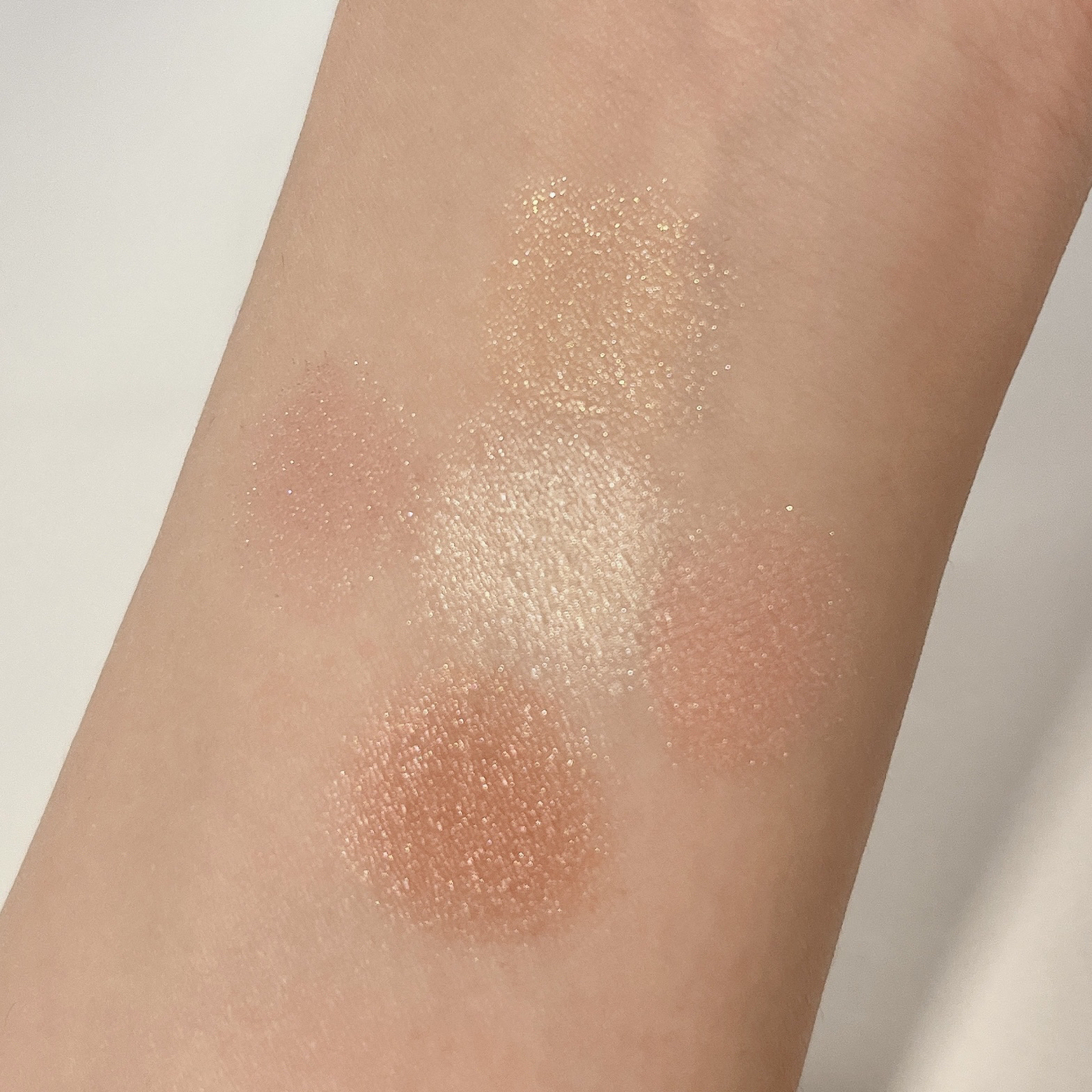 真ん中にパール感たっぷりのクリーム状アイベースがあって、それを囲むように4色のカラーがセットされていて、ミラーもチップもちゃんとついてます💡 透け感のあるパール感と、細かいラメがチラチラ✨柔らかい発色で、色同士のハーモニーを楽しむような感じのパレット☺️ まさしく春にうってつけのアイテムです💐