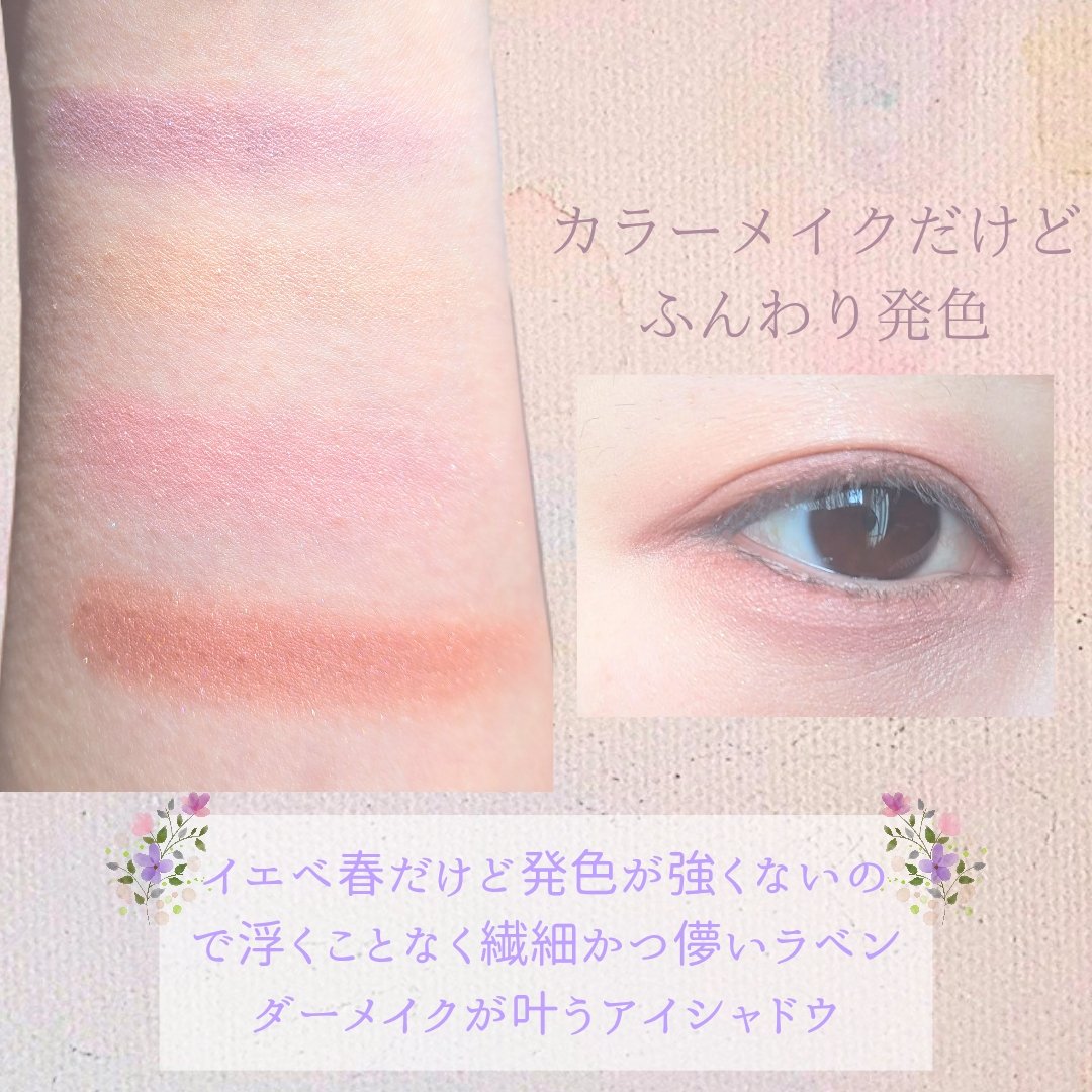 真ん中のシマーブライトカラーは、アイシャドウベースとして使うと密着力も発色もUPしてとても優秀。オイルベースと聞くと、勝手なイメージでヨレそうって思ってたんだけど、実際に塗るとサラッと仕上がって驚いた😳まぶたの色むらを飛ばしてトーンを整えてくれる効果もあるし、ハイライトとして使用することもできる優れ物◎ ペタルカラーといわれる周りの4色は、透け感とツヤ感があって、纏うだけで目元に透明感が宿ります🤤✨ わたしが選んだ04は発色が優しめだから失敗しにくいのも嬉しい。そして重ねるほどに色は出るけど、決して汚くならないのが最高なの。 これぞ春って感じの、明るく軽やかなパステルカラーが完全にツボなのと、締め色ポジションの赤みブラウンが濃くないところがお気に入り。 ラベンダー、イエロー、ピンクと華やかな配色ではあるけど、優しい発色だから奇抜にはならないし、いろんなメイクが楽しめるのは04の魅力だと思う💐