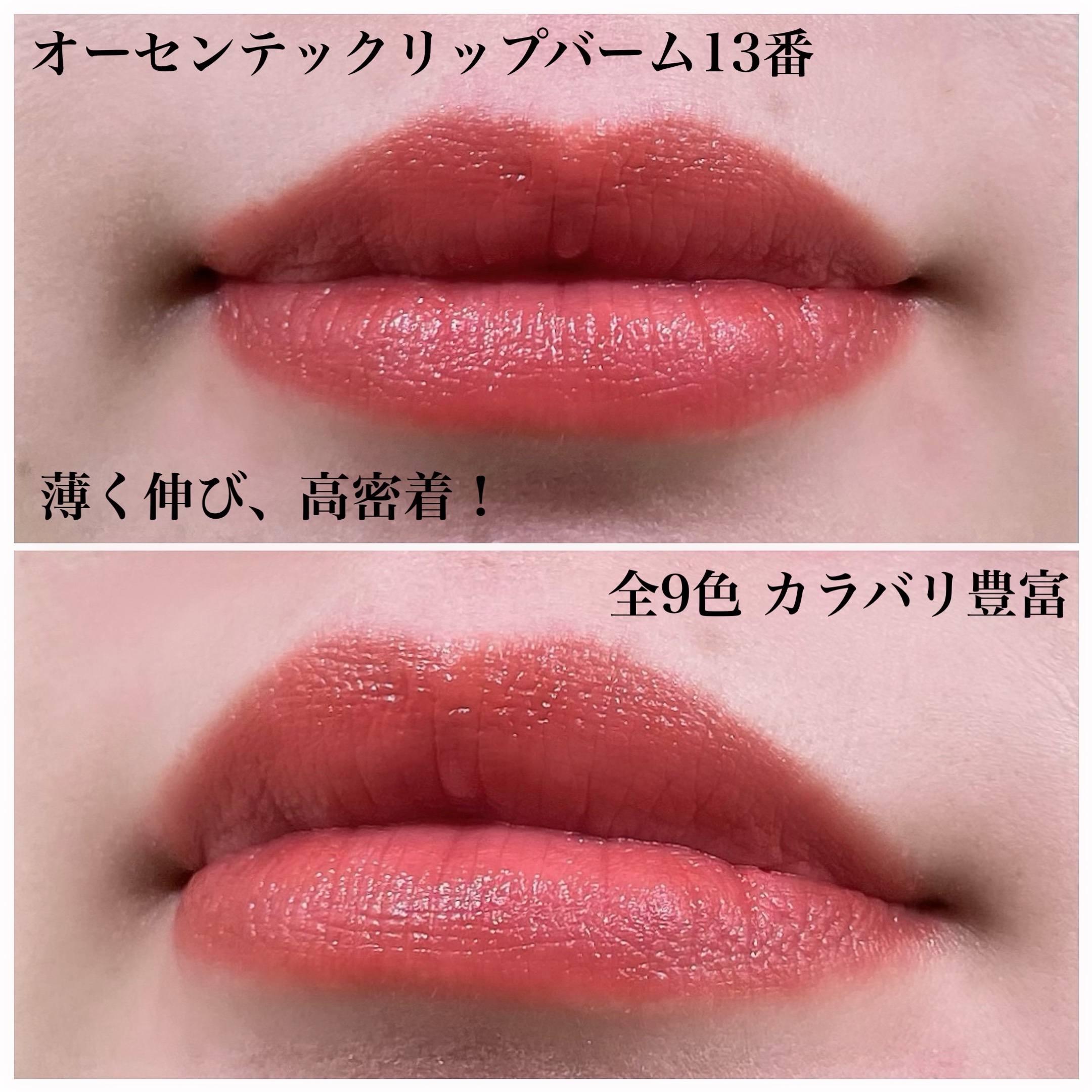 ナチュラルに過ごしたい日でも軽やかに使えるatheのオーセンティックリップバーム! 9色展開で、ナチュラルなのにそれぞれしっかり違った色味に発色するので、ナチュラルすぎて色が薄かった~〜😱なんていう失敗もしにくい! 1度塗りだと発色もナチュラルだし、塗り重ねると、シアーなのにしっかり色味は出る! 1度塗りだと、すっぴんでも浮かずに血色感足せるし塗り重ねると、しっかりめにメイクした日でも他のパーツに負けることなく、バランス取れる🙆🏻♀️ 保湿力もあるから、1本でスルスル塗れるし、ベタつきとか重たさがなくて、軽い付け心地◎