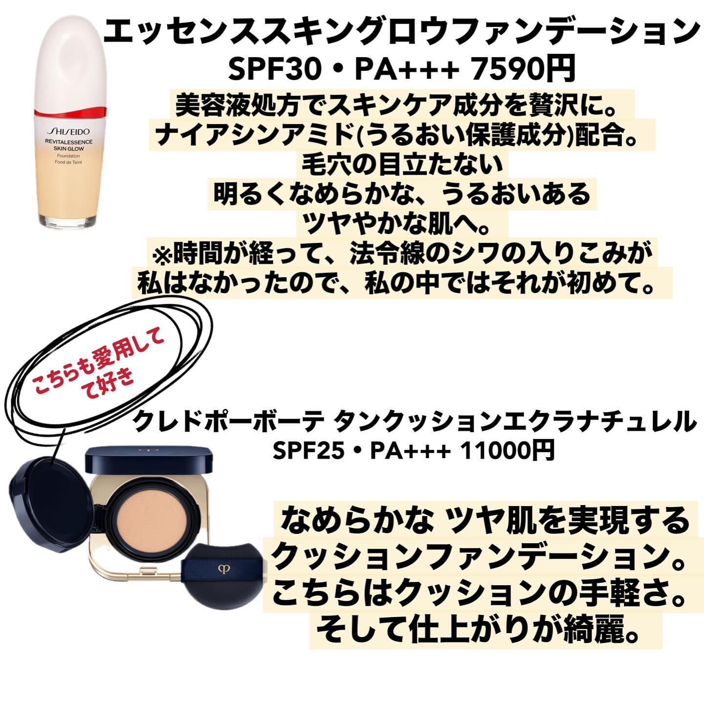 【若く見えるベースメイク・選び方】今日のストーリー投稿の アンケート、ご協力頂いた方ありがとうございました☺️💜(インスタ)この2枚目のアンケート結果はこのまとめ投稿作成時のものです。《老けて見えるベースメイク》詳しくは写真の方で。●厚塗りになり、ツヤ感がない。●塗り方が間違えていて、時間が経つとシワが目立つ。《若く見えるベースメイク》写真文字少しミスってます💦●何も塗ってないように見える、ツヤのある活き活きした若々しい印象。●肌にツヤがあると、潤ってハリがあるように見えるので若見えに繋がる。そのために、程よいツヤ感のある下地を仕込んでも🙆♀️⚠️若い時みたいに毛穴のないつるんとした肌にしたくて厚塗りすると、若いうちは肌がピンとハリもあるから綺麗につくし持ちもいい。…けど…大人肌は、時間が経つとシワや乾燥が目立つ。💭🤔時間が経つとともに、ファンデの法令線のシワや目の下のシワなど、気になる時はありませんか❓❓《選び方》写真を参考にして下さい●透け感ぽいけど、薄づきに見せて肌の色ムラ、くすみはきちんとカバーできるファンデを選ぶと🙆♀️●時間が経っても乾燥しない、シワに入りこまないファンデを選ぶ。●いつもお話ししてるメイクの足し算引き算。ファッションなどに合わせて。例えばカジュアルなときはナチュラルなベースメイク。お出かけや、お洒落してお出かけしてファッションもチカラ入れてる時はある程度ベースメイクもしっかりめに。(厚塗りじゃない)✅私はナチュラルな時はHAKUの日中用美容液で少しトーンアップするのでその後スノービューティーで時短仕上げ。《つけ方》写真とハイライトを参考にして下さい。(インスタのハイライト)《私のおすすめベースメイク》●エッセンススキングロウファンデーション@shiseido_japan@shiseido_gfs.ginza説明は写真を参考にして下さい。ファンデーションの色選びは、首との差がない方が自然に仕上がります。新しく出た化粧下地が気になってますがまだサンプルも未使用の為、詳しくはわかりませんが良さそう!下地とファンデを同じシリーズのを使うと下地はそのファンデの持ち、つきを良くするようにもできてるので相性が良いです💜✅今まで色々とファンデーションを使ってきましたが、若い頃も時間が経つと法令線にシワに入りこんでたりしましたが、こちらのファンデは、それがなく感動しました🥺✨️●クレドポーボーテタンクッションエクラナチュレル@cledepeaubeaute説明は写真を参考にして下さい。✅ボーテのファンデはなん十年とリニューアルしてもクレドポーの時代からリピしてます。仕上がりがとても綺麗!クッションは手軽なので。ボーテのファンデは仕上がりの好みで何種類かあります。●クレドポーボーテコレクチュールヴィサージュn@cledepeaubeauteこちらも写真を参考にして下さい。✅こちらも昔からリピしてるコンシーラー。スティックの方がハイカバー🙌※最後に動画があるのでカバー力を見て下さい。こちらも、コスパ良いです!🙆♀️昔白のファンデがあったのだけど、コンシーラーの筆タイプでもいいから復活しないかなー?🤔肌を明るくするのに目の下などに入れたりして便利でした☺️●ローラメルシエルースセッティングパウダートランスルーセント@journaldelmこちはも写真を参考にして下さい。✅ベースメイクといえば、ローラメルシエ。このフェースパウダーも何度もリピしてます。コスパも良い!💜透明タイプだから白浮きしないし、透明感あるナチュラルな仕上がり。ソフトフォーカスで毛穴も目立ちにくい。《使用アイテム》●エッセンススキングロウファンデーション130(少し黄みよりの明るめ)●クレドポーボーテコレクチュールヴィサージュライトオークル●ローラメルシエルースセッティングパウダートランスルーセント●セザンヌフェイスグロウカラーSP1ヨザクラグロウ(左のみ)つけ方なども大切なので、ハイライトを参考にしてみて下さい。長くなってしまったので、また時間ある時に化粧下地、投稿できたらと思います。何か質問がありましたら、コメント欄へどうぞ🥰#ファンデーション#ファンデーション選び#コンシーラー#コンシーラーの使い方#フェースパウダー#大人メイク#若見えメイク#shiseido#エッセンススキングロウファンデーション#エッセンススキングロウファンデーション130#コレクチュールヴィサージュ#タンクッションエクラナチュレル#ローラメルシエ#ルースセッティングパウダートランスルーセント#セザンヌ#フェイスグロウカラー#フェイスグロウカラーsp1#メイク好きさんと繋がりたい#miwa愛用品#デパコス購入品#ツヤ足しハイライト