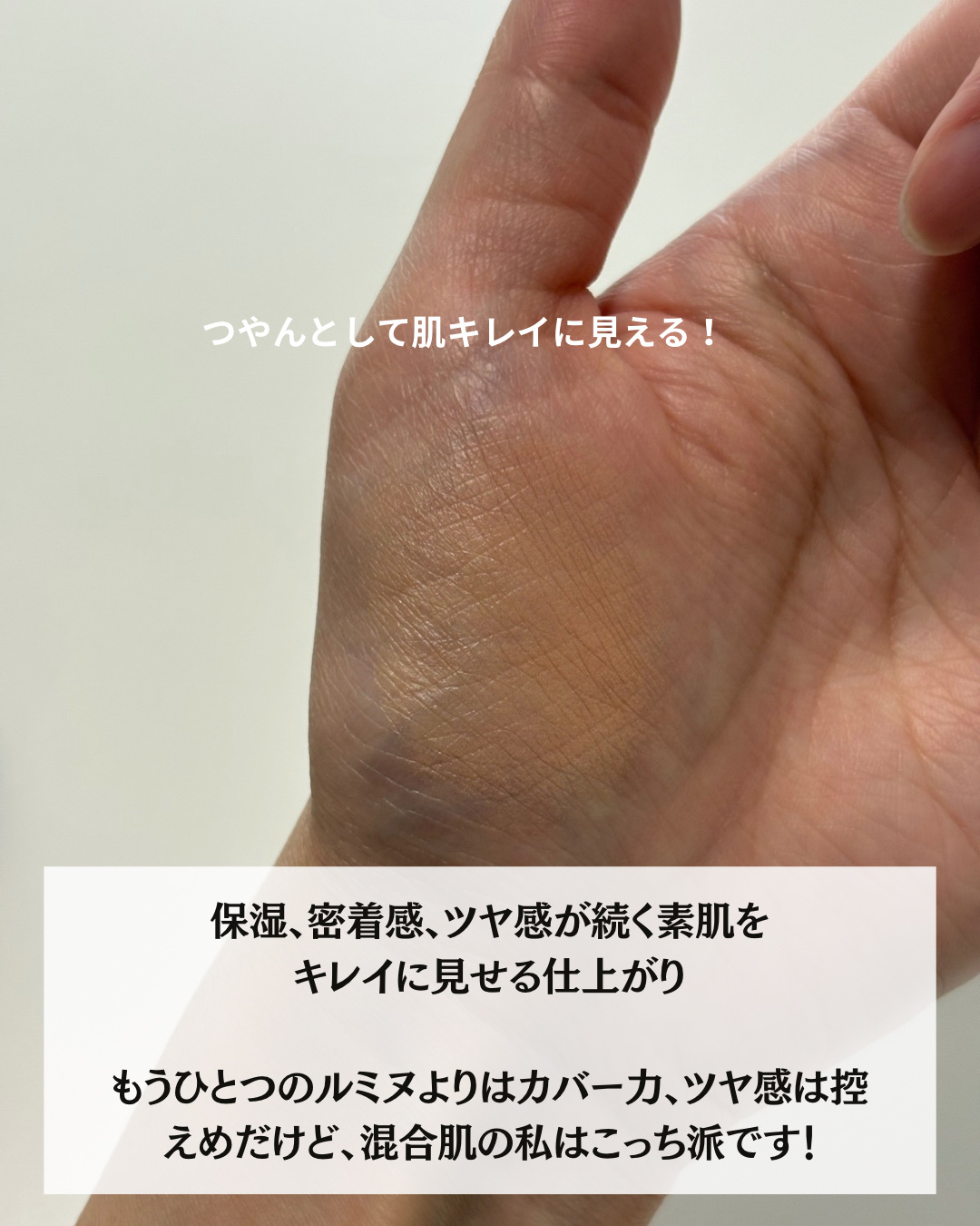 1回使うと忘れられない質感✨ スーッと肌に薄ーく伸び密着してくれる✨ カラー選びは店頭で相談するのをオススメ🫶🩷(まさか私がピンクオークルが肌に馴染むだなんて思ってもいませんでした) ナチュレルは薄膜で肌に密着 『ルミヌは肌にのりカバー力がある』
