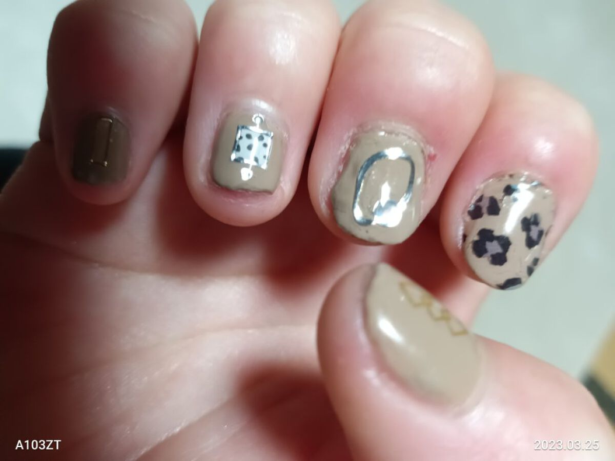 ベースにノンパールのシンプルなベージュを2度塗り。 乾いたらパールの入ったベージュでピッピッと模様を。 ボトルのふちでしごいてハケから液を落としパサパサに近い状態で描くと薄くかけていいです。 乾いたらゴールドも同様に重ねる。ゴールドは少し多めの配置で。 たっぷりトップコートを重ねてつやっとさせて完成。
