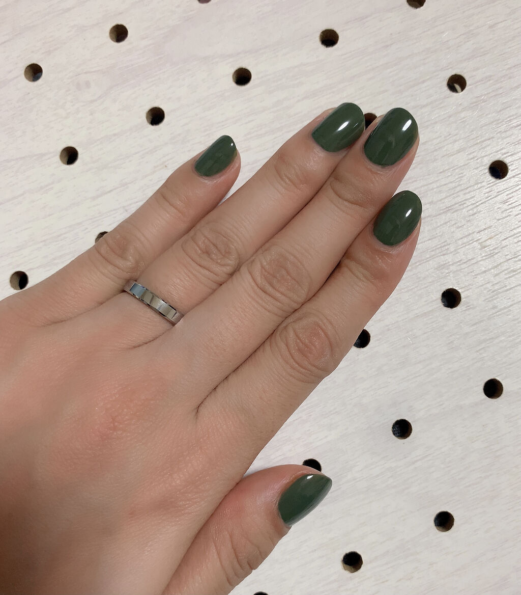DAISOのgeneTOKYOネイルオリーブ+:-:+:-:+:-:+:-:+:-:+:-:+:-:+:-:+:-:+:-:+ダイソーのこのネイルはカラバリがおしゃれで気に入っています!遠目に黒っぽく見えますが深緑です。二度塗りしています。高...