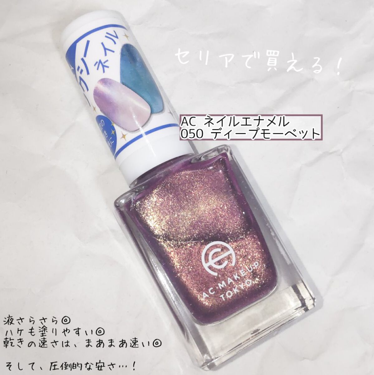 \セリアのACネイルエナメル沼に落ちそう…♡/★ACネイルエナメル【050ディープモーベット】ピンクパープル(赤紫系?)にゴールドラメ!爪を動かしてみると、赤紫からゴールド強めに表情が変わるので、なんだか100均で買えるような色じゃない気がし...