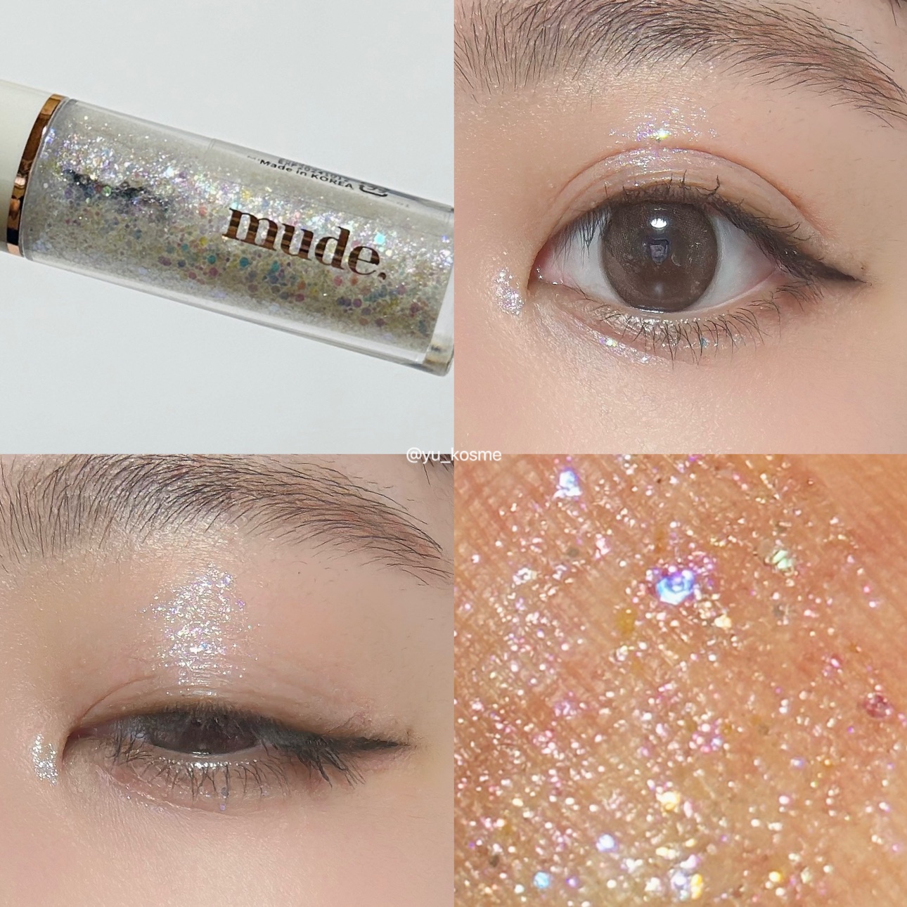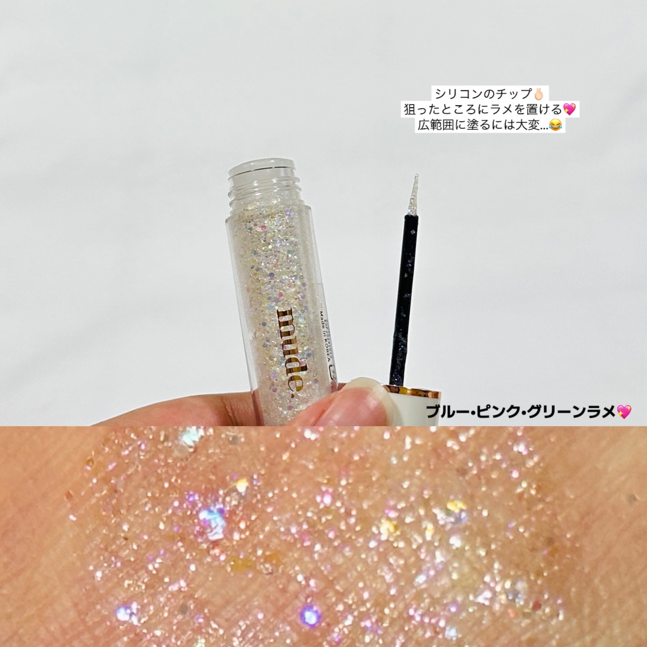 mudeのグリッター、かわいすぎませんか?😇 ちょっと伸ばすといろんな色のラメがチロチロするのー!愛ー!!! 私くっっそ敏感肌で特に下まぶたが弱いけど、今のところしみたり荒れたりはないです🙆♀️ 大粒ラメのグリッターほしいなって方は一旦チェックすべし!