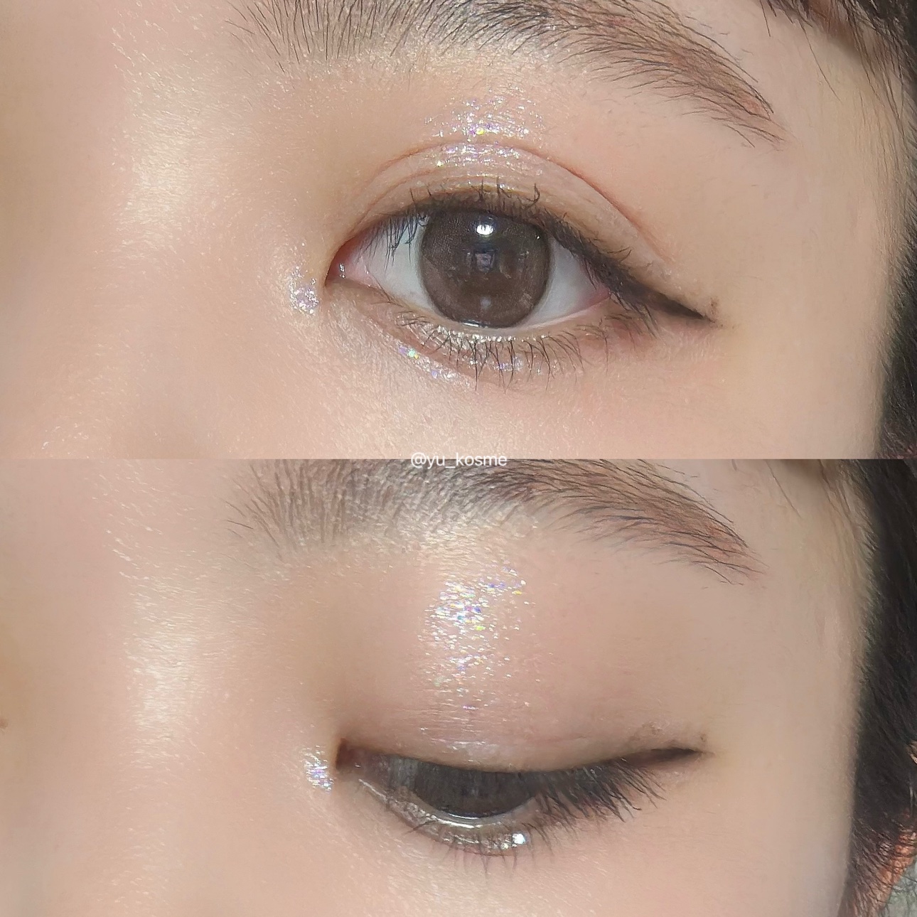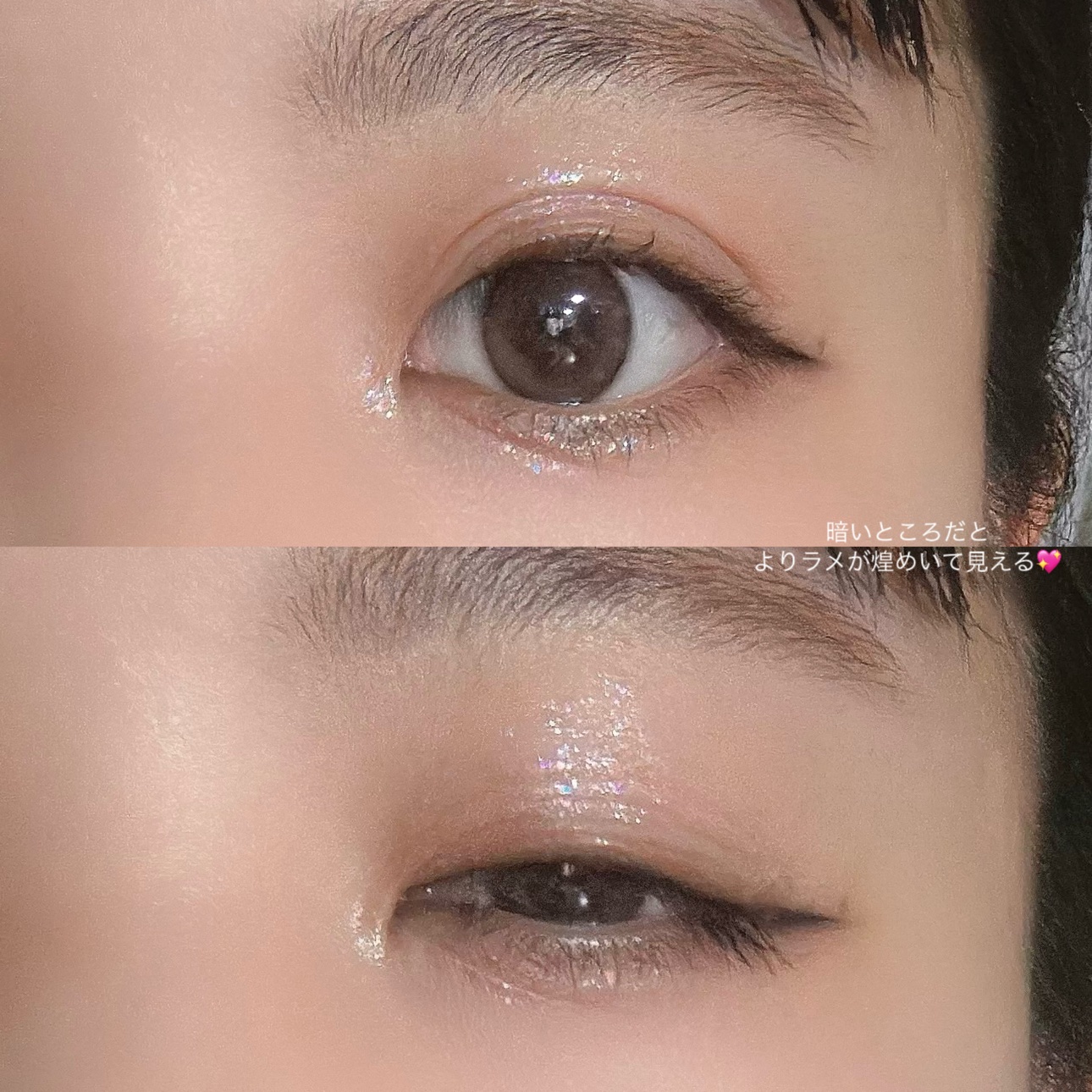大小揃った多色ラメが角度によってキラキラするのが可愛い。 調節しやすくて浮かないラメ感だから大人メイクにも使ってほしい。 細いブラシで部分使いもばっちり🙆♀️ ベースが白っぽくならないので誰にでも使いやすいように感じました! 全4色あるので残りの色味も使ってみたい❤️🔥 多色ラメと華やか大粒グリッターの組み合わせ 50%以上水分ベースで自然なツヤ感も密着も叶える 華やかラメからほんのりラメまで色んな雰囲気のメイクが作れる 量を調整しやすい細いブラシで扱いやすい 多色ラメが角度によってそれぞれ輝いて立体的な目元を演出