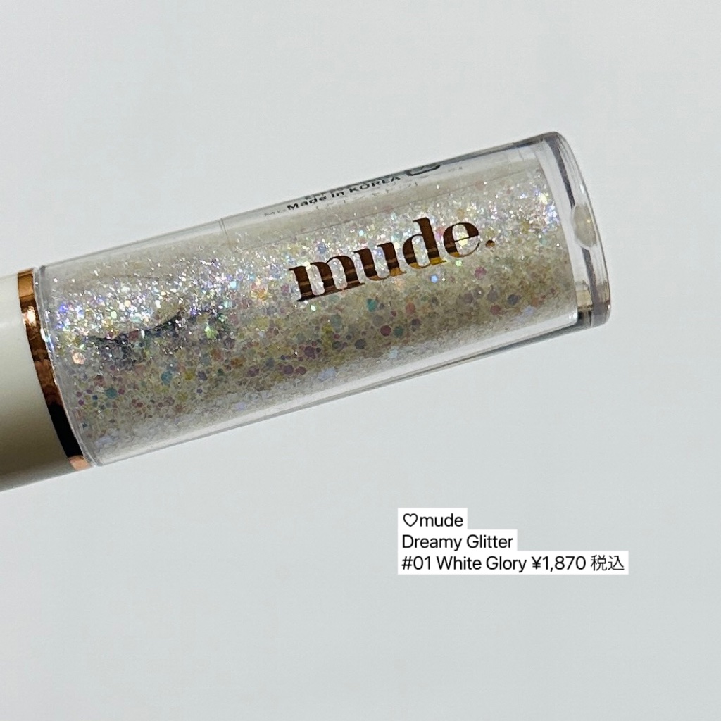マスカラで有名なmude.ですが、めちゃくちゃ可愛いグリッターもたくさん出てるんです!! しっとりとしたテクスチャー 50%以上がウォーターベースで密着 量を調節しやすいアプリケーターで初心者さんでも繊細に塗布可能 私の推しポイントは、アプリケーターがシリコンなのでグリッターがピンポイントにのせやすい所👍🏻 01 WHITE GLORY は シルバーベースなのでラメだけのせたり、大粒から小粒のラメが入っているので、その日のメイクに合わせやすいかなと思います💕 4色展開ですが、どれもそれぞれ可愛くて、合わせて使っても上品なグリッターなので大人っぽく可愛く仕上がるアイテムです☺️ LIPSでも購入できるので、ぜひ気になった方はチェックしてみてください✨