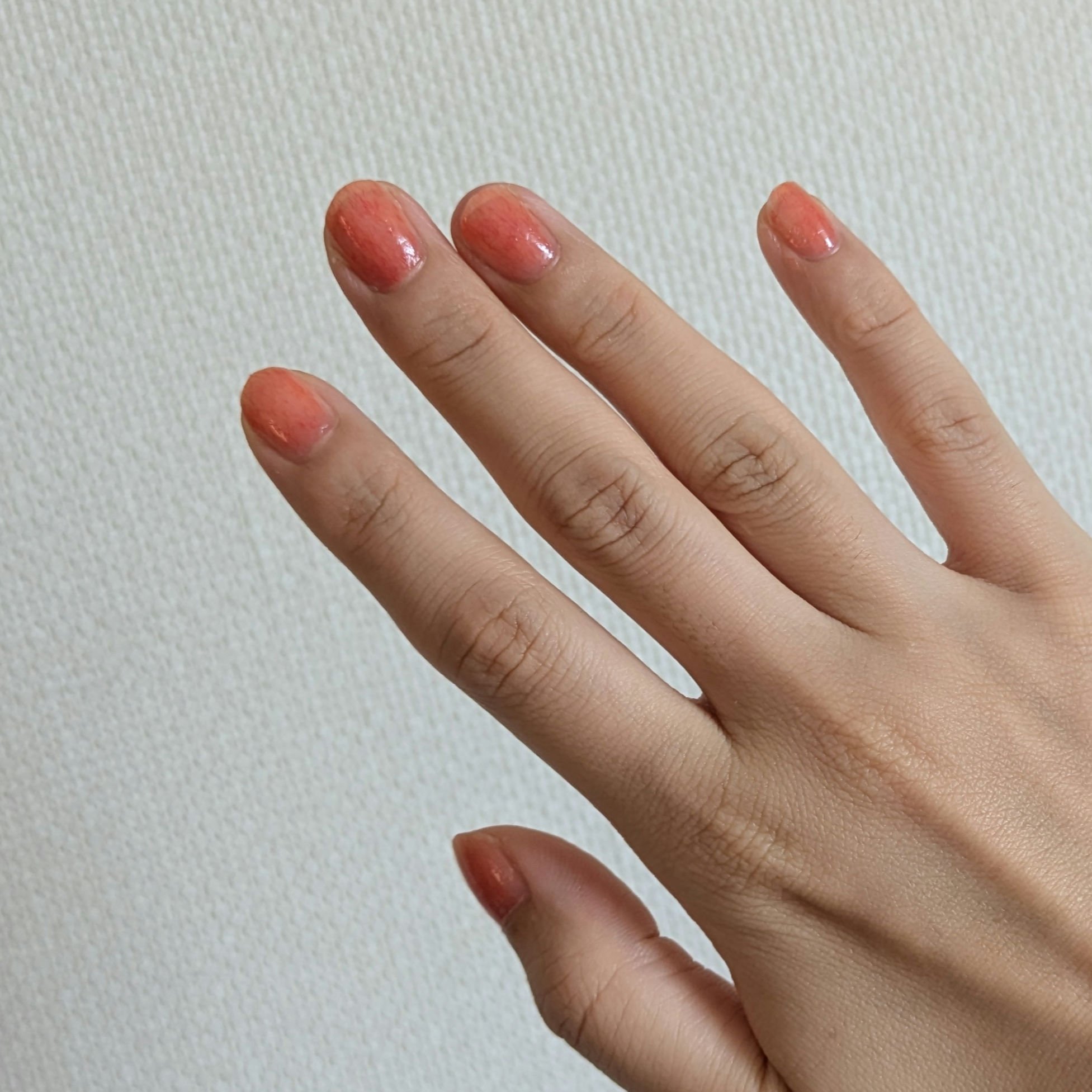 すごく塗りやすいです!!😳 変にはみ出したりせず、綺麗に塗れました⭐️ あとは、ベースの色味は透け感があるので、グラデネイルにピッタリです!! 透明タイプなおかげで乾くのも早くストレスフリーでした🥺 仕上がりは本当に桃みたい🥰 爽やかジューシーな仕上がりでこれからの季節にピッタリだと思います✌🏻 繊維が入ってると塗りにくいんじゃないかなって思ってたんですけど全然気にならず 簡単に仕上げることが出来ました! 1000円内で買えるので、みなさんも是非使って見てほしいです🥳