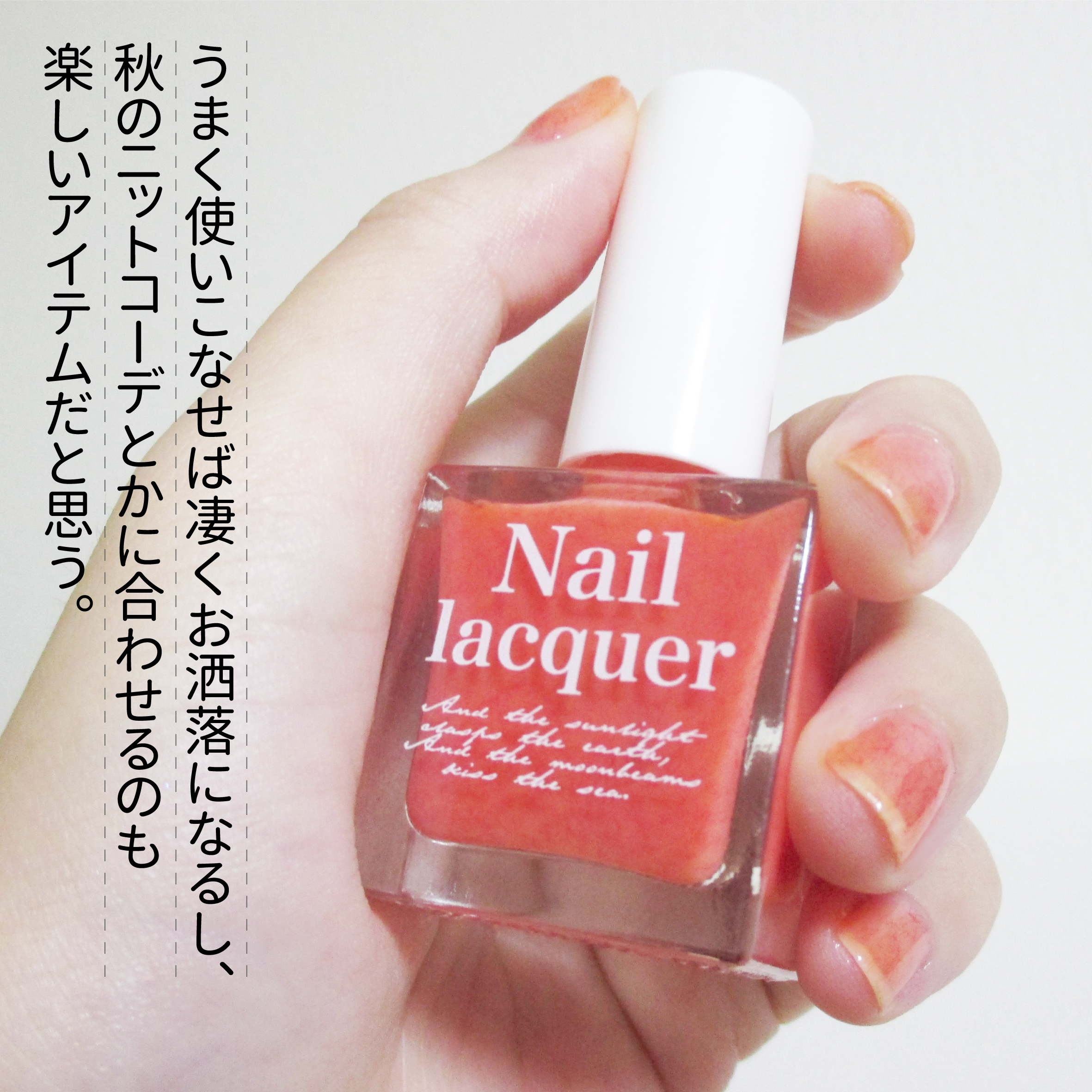 繊維ネイルって初めて聞きました マニキュアの中に細か〜い産毛みたいな繊維が入っております ももジャムの色味はとてもかわいいです 名前もかわいい🍑 ポップなコーラル系カラー オレンジみのあるピーチピンク?春夏に使いたくなるような感じ