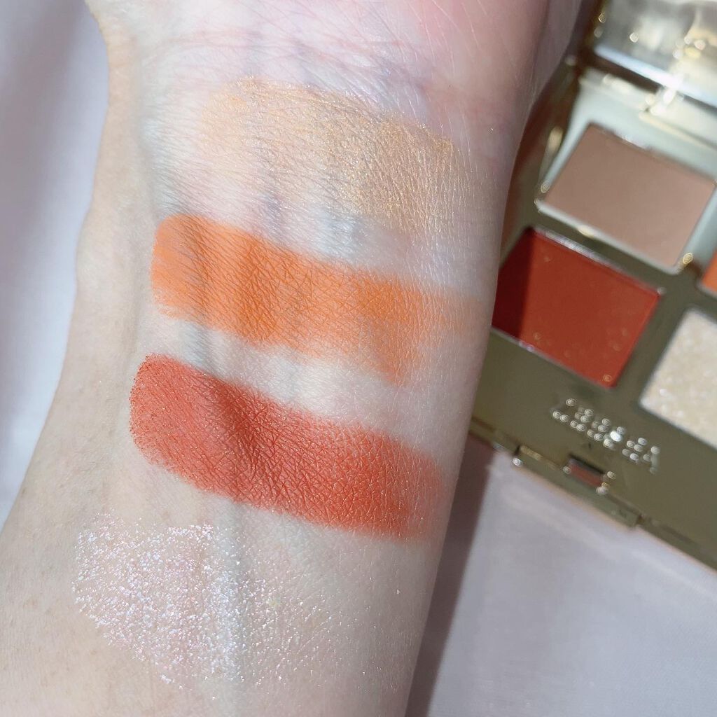 とにかく可愛いです!手のひらサイズの4色アイシャドウです。 質感がツルツルなパッケージでとても高級感があります。 02オレンジ 色味はものすごく可愛いです。 ただ、発色があまりにも良すぎました…。 他のオレンジ系茶色の馴染みの良いアイシャドウを使った上で、ポイントとして右上や左下の濃い色を使うのは可愛くて好きです。 03パープル スウォッチで見ると紫陽花カラーでとても可愛いです。 特に動画で乗せている左上のラメが奇跡かと思うほど可愛いです。 ただ、こちらも発色がものすごく強く、当方イエベだけどいけるかなーと思って購入したのですが、全くいけませんでした。 私はポイント使いでも悪目立ちしてしまいました。 ブルベの方であれば使いこなせるかもしれません。 オレンジ系も普段めったに出番が無く、パープル系も私は全く使えませんでした😢 ただ、パッケージが本当に可愛いので星3です。