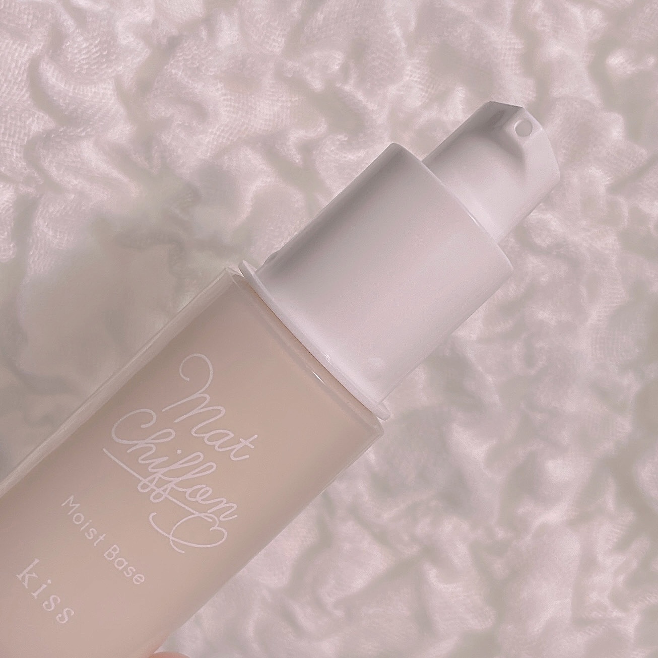 #kissKiSSマットシフォンUVモイストベース01ෆ商品説明ෆ美白ケアをしながらテカリを抑える、さらふわ美白下地毛穴をきれいにカバーSPF26PA++ヒアルロン酸・リピジュア®・植物性セラミド・カモミラエキス配合(すべてうるおい成分)ニキビのもとになりにくい処方紫外線吸収剤無添加・無香料ෆ使用方法ෆスキンケアで肌を整えたあと、1~2プッシュ分を頬の高いところ、鼻、額、あごの順にのせます。顔の内側から外側に向かって指の腹で軽く叩き込むようになじませます。ෆメモෆ固めのテクスチャ伸びにくい匂いが独特皮脂は出にくい購入日/2024.12.5購入場所/LIPS