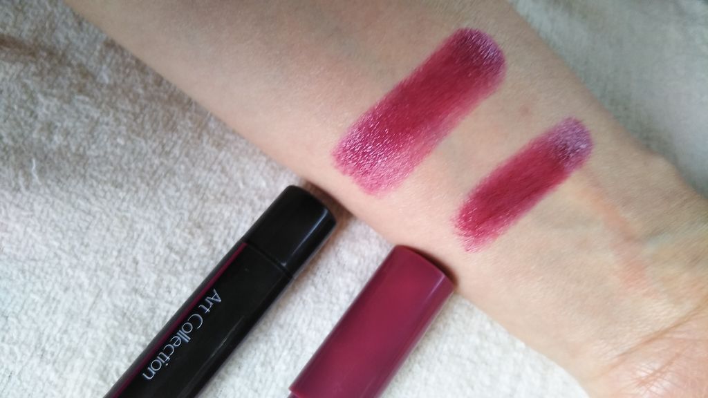 目を引く鮮やかカシスレッドのオイルインリップ。セリアで以前購入したものです。リップ本体を見るとキラキラとラメがたくさん入っているのが見えます。 ピンクとかゴールドとか赤っぽいラメに見えますね。実際唇につけてみると、ラメはしっかり唇全体に乗りますがかなり小さめでもあるので距離を置いて見るとものすごく目立つわけでもないかな。ラメよりも色自体にインパクトがあるな~と思います。オイルインリップということで、シアーというか、薄づきなのかな?と予想していましたが私の顔だとかなり唇が目立って見えます。カシスレッドだから暗さがあるかなと思ったけど色がけっこう鮮やかなんだな。青みがかった赤とかピンクみたいな。色も口紅のようにしっかり乗っている。 (追記 この商品はリップカラーでした。)わりとはっきりとした色でポップな印象。私は少し色が乗っただけでけっこう唇が目立つ薄い顔なので、他の口紅などと共につかったり、黒グロス的なものとあわせてちょっとくすませたりしたほうが使いやすいかなあ。ポンポン薄めに塗るとか。 ティッシュオフ多めにするとか。そのまま鮮やかなリップの色を楽しむならしっかりアイラインを引いたアイメイクをして、ウィッグなどもつけて、バランスを取ったりしたらいいのかな?(それもきっと楽しいね!)このように💄リップこの先は尖っておらず、平行にカットしてあるタイプです。量はかなりたくさん入っていそうでなかなか終わらなそうだから、このシリーズ、コスパはとてもよさそうだな。ぬりごごちは、冬の私の極寒の部屋ではやや固く感じました。その後部屋を暖めてから塗るとするするとついたので室温とか気温でつけ心地が変わるのでしょうね。ツヤはある程度ありますが唇の縱皺は見えるので、(特に下唇)よりちゅるんとみせたいひとはグロスを併用したらよいのかなとおもいます。拭くタイプのメイク落としで唇を拭くとラメはほぼとれましたがリップの色は少し残るかなという感じです。