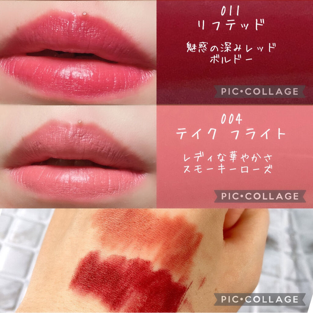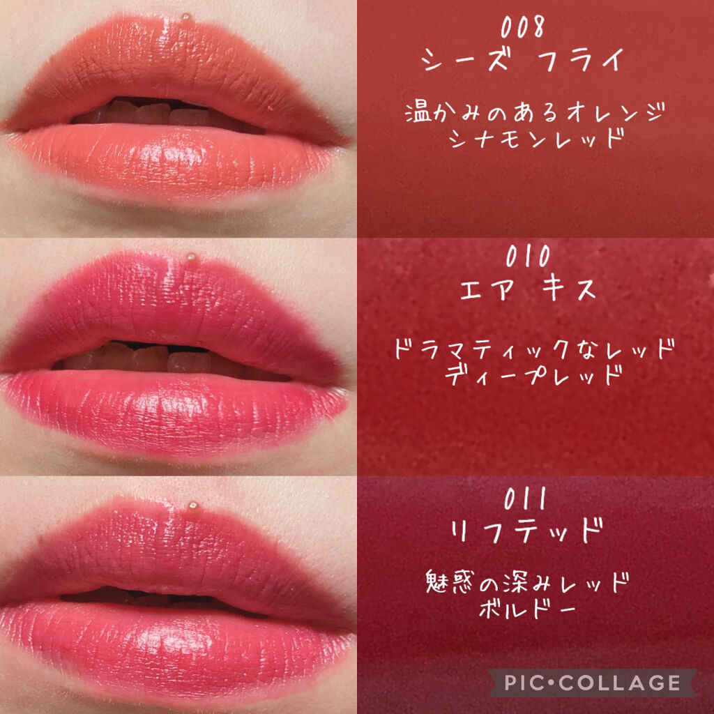 この細い形がかなり塗りやすくて良かった! 唇の山とかキワも細かく調整できます。 個人的にかなりの推しポイントは、リップクリームの上から塗ってもはじかなくてなじむところ♡それぞれのカラー、マットに仕上げたり少しツヤのある仕上がりにもできちゃいます! お気に入りカラーは001と002かな♡
