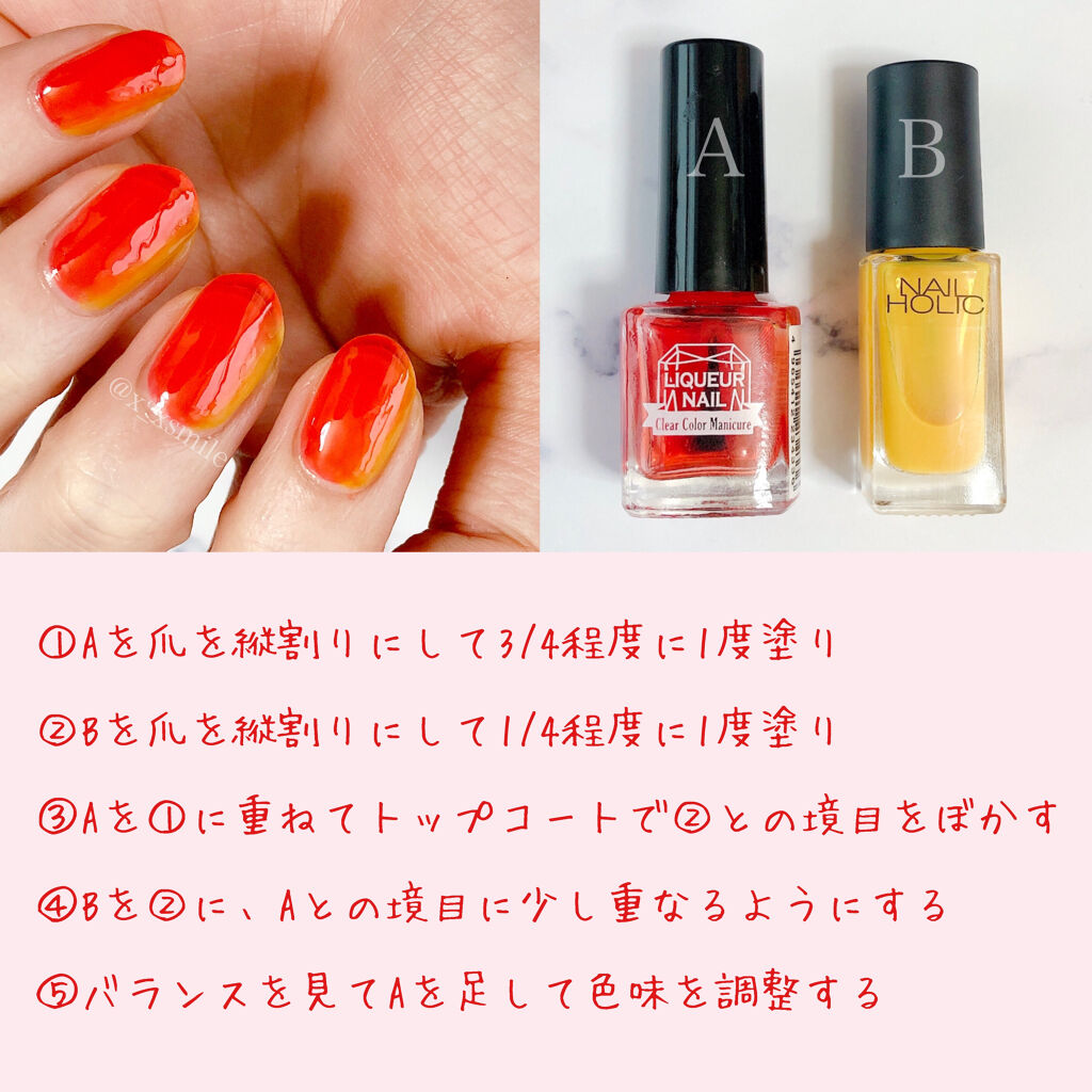 今日はリキュールネイルを使って斜めグラデのもみじ🍁ネイル💕★TMリキュールパイン(DAISOのシロップイエローでも○)★TMリキュールプラム(シロップピンクでも○)★ちふれ744(深めのオレンジカラーで代用○)上から順番に、位置を変えて、斜め...