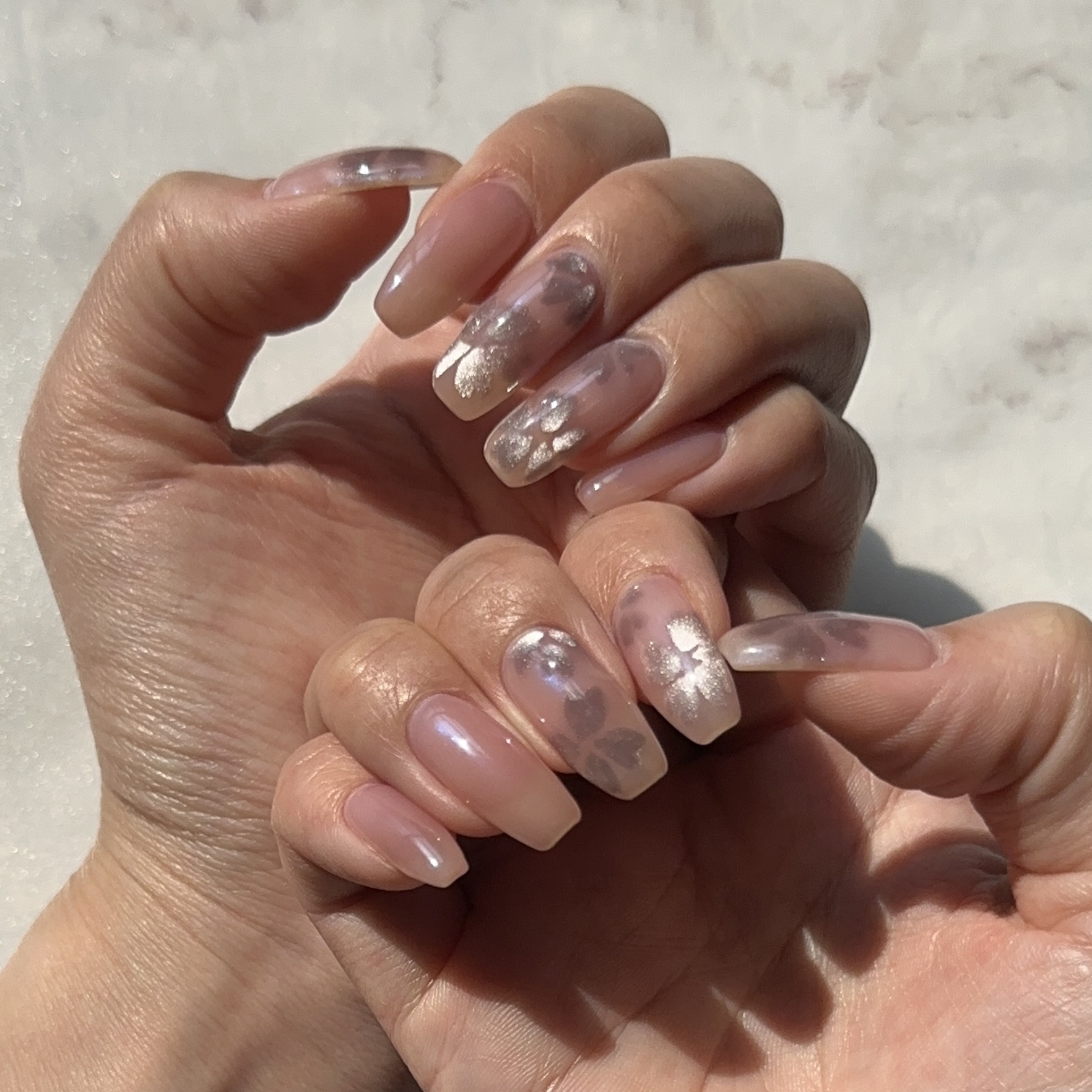 うすーーーく2度塗り どんな肌色にも合う万能スキンカラー 100円なのに一軍やないかいっ! って改めて感動したジェル🥺 細か〜いラメが綺麗✨ ネイリスト使用率1位のビジュージェル✨ 私調べ セルフだとネイルタウンさんの使ってる人が多いけど、プロだとなぜかコチラが多い✨ 操作しやすいテクスチャーでミラーのり抜群です😳 サラサラのテクスチャー✨ ミラーがハゲないか心配なら2度塗りがオススメです❤️