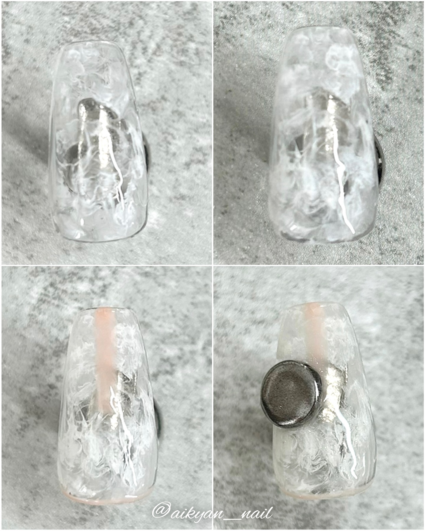 ネイル工房の痛ライナー黒をベースに黒ならなんでもOK🙆♀️ ネイル工房のシルバーマグネットシルバー(シルバーマグネットならなんでもOK👌)を、塗って 光を中央に集めます! 薄くシアーカラーを塗って硬化 ネイル工房痛ライナー黒で顔を描いて硬化 トップコート塗って完成てまございます👏