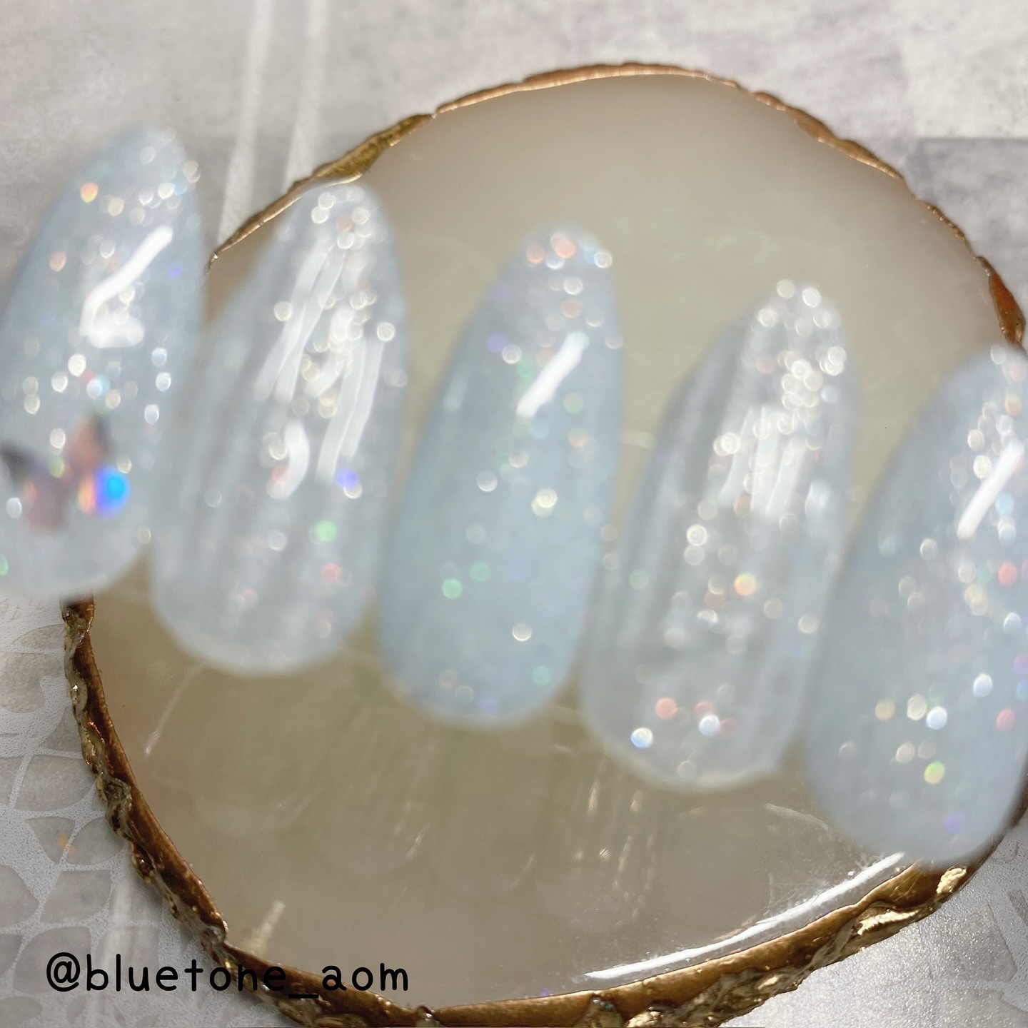 ネイルメモ冬&控えめキラキラ¬クリスマス🌟親指・中指・小指1.ベースジェル2.白に少しだけ黒と青(全てSeria)を混ぜた色を2度塗り3.ジェルミーワンクリアを短めに硬化(30秒くらい)4.虹色のネイルホイル(ネイルタウン)をできる限り...