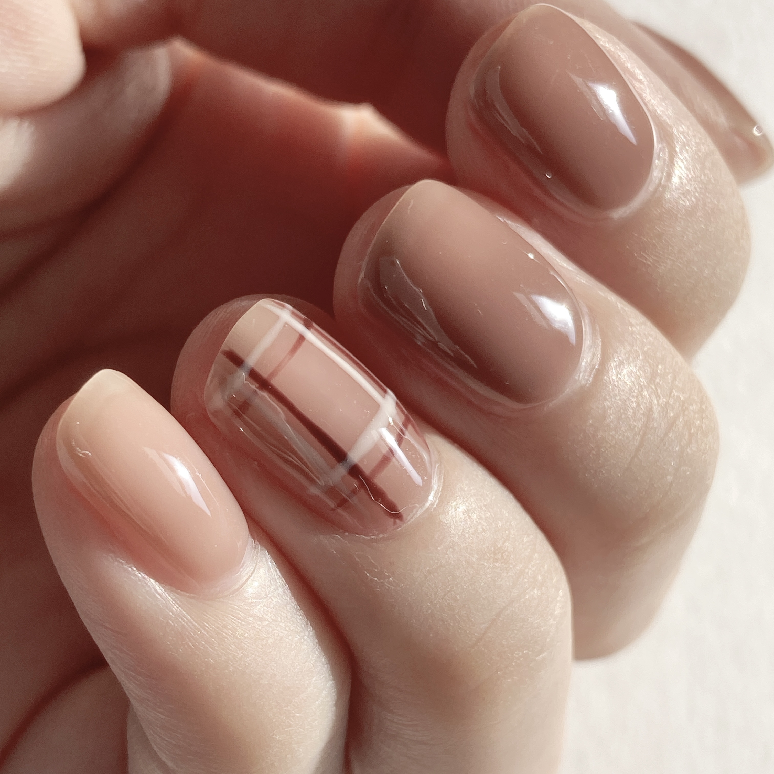 秋ネイル🍂チェック柄セリアのココアブラウンを使ったネイルですこの色すごくおすすめです薄く塗ると爪のピンク感もありつつ可愛いブラウンになります濃いめに塗るともう少しブラウン感が増しますあまり黄色ぽくないのでどちらかというとミューテッド、ブルベ向きのブラウンに感じましたチェックを描くのはもう少しライナージェルとかラインを描く用のジェルだとパキッと細い線が綺麗に描けそうだけど手持ちのもので済ませました白はライナージェルとか使うとパキッとして綺麗なんだけどねブラシはネイル工房のゼッカブラシショートライナーですがロングライナーがある方はそちらの方が線は引きやすいと思います#セルフネイル#ジェルネイル