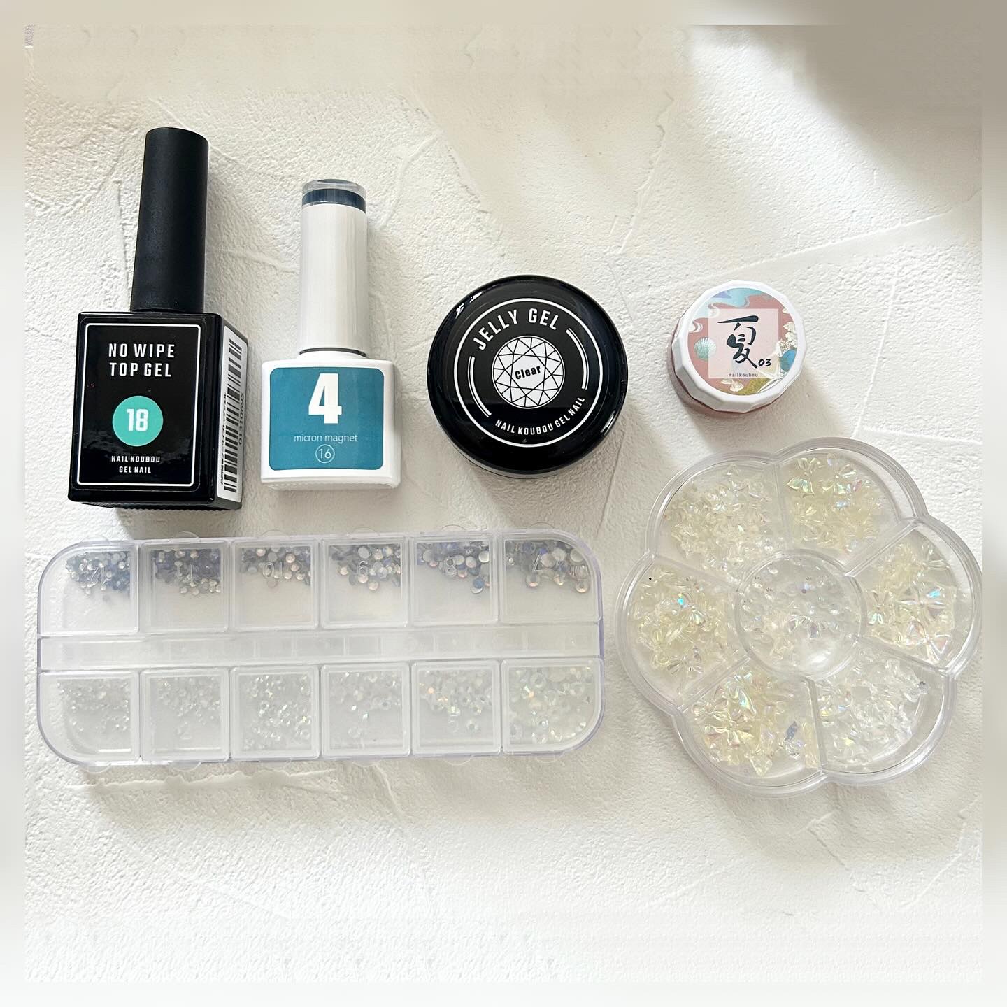 5ミクロンより細かい粒子! 4ミクロンマグネット🧲✨ 粒子の動きも早いし うるうるちゅるんも簡単💕 ①4ミクロンマグを塗布し真ん中を光らせ硬化 もう一度繰り返す ② JELLY GELを乗せ斜めにピンセットで押し スタッズを交差している所に乗せ硬化 溝が無くならないように薄くトップをして硬化\完成/ リボン- ①4ミクロンマグを塗布し、輪になるよう光りを 動かし硬化 パーツを乗せ\完成/ フレンチ- ①夏03を一度塗り 4ミクロンマグをフレンチに乗せフレンチのカーブに沿って 光らせ硬化 パーツを乗せ\完成/