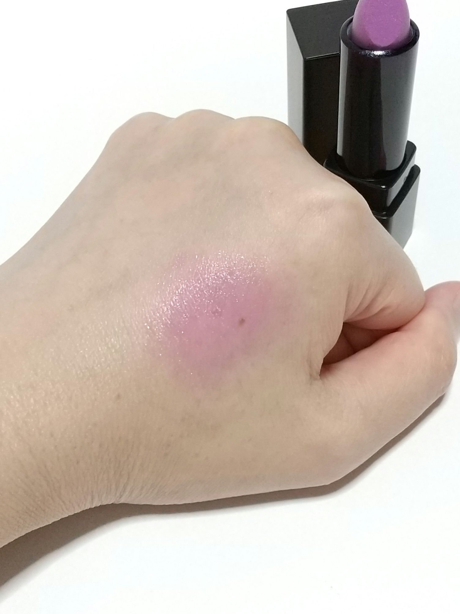 出したらめっちゃ紫❗️ このまま発色したらバブリーやなw と思いましたが大丈夫でした シアーな青みピンクに微細ピンクラメとパープルラメ入り✨ 唇に乗せるとツヤっとなりましたん💕 青み好きさんにオススメしたいけど限定だったのねー