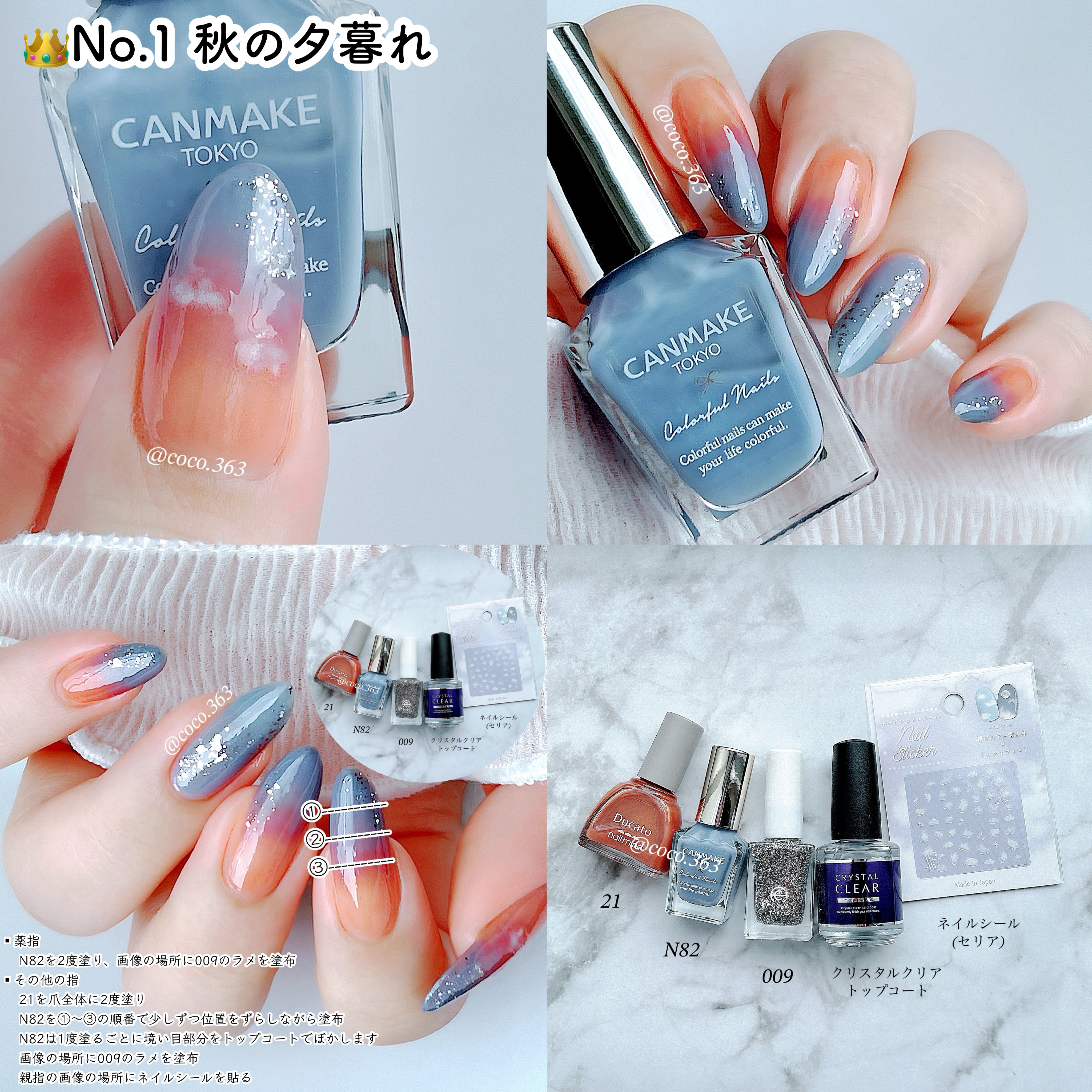 思っていたイメージを具現化するのはほんとうに苦手なのですが💦 1位に選んだ〚秋の夕暮れ〛はイメージに近いものができたな〜と何度も爪を見てしまう自分的に好きなネイルでした☺️✨ ネイルデザインの参考になればうれしいです🎶