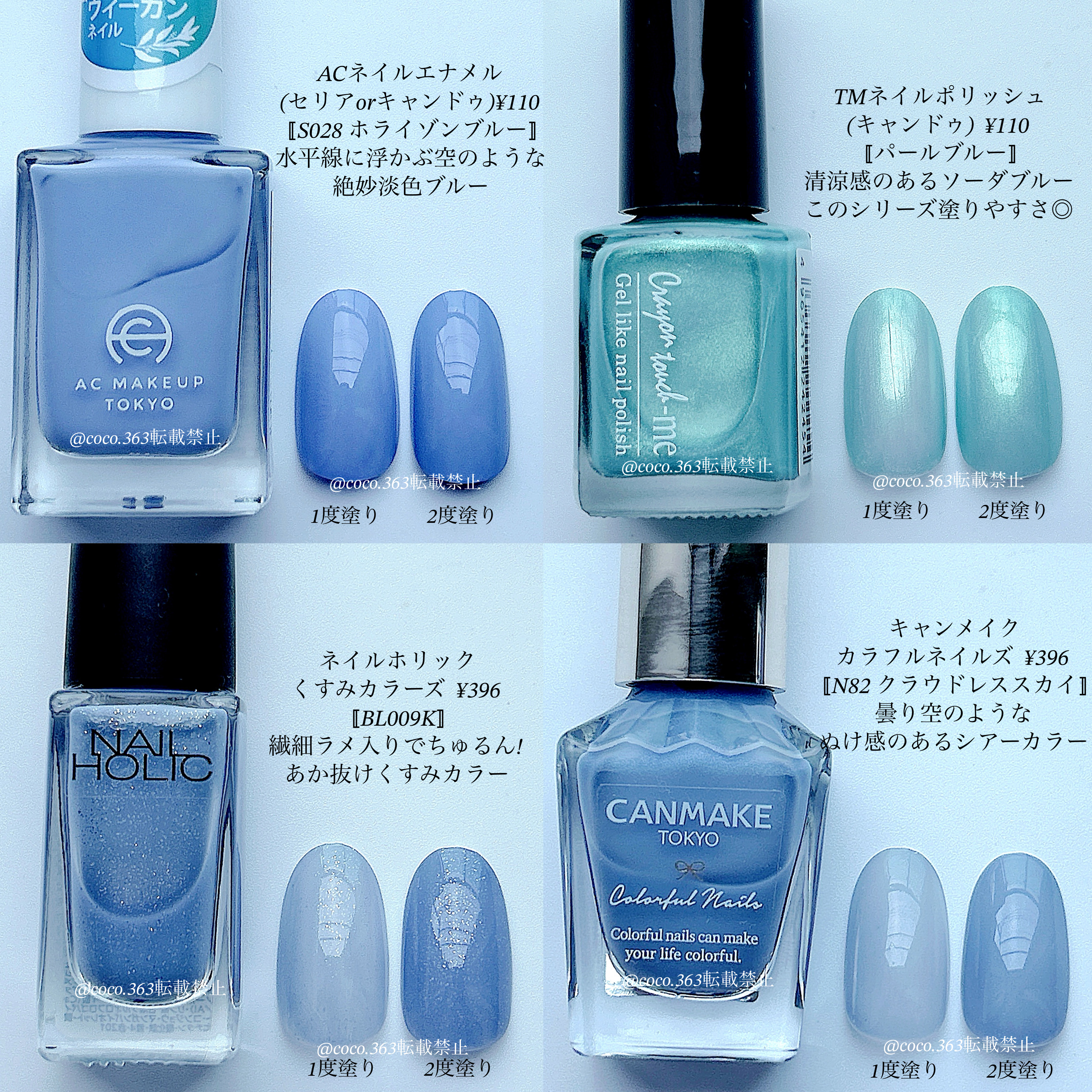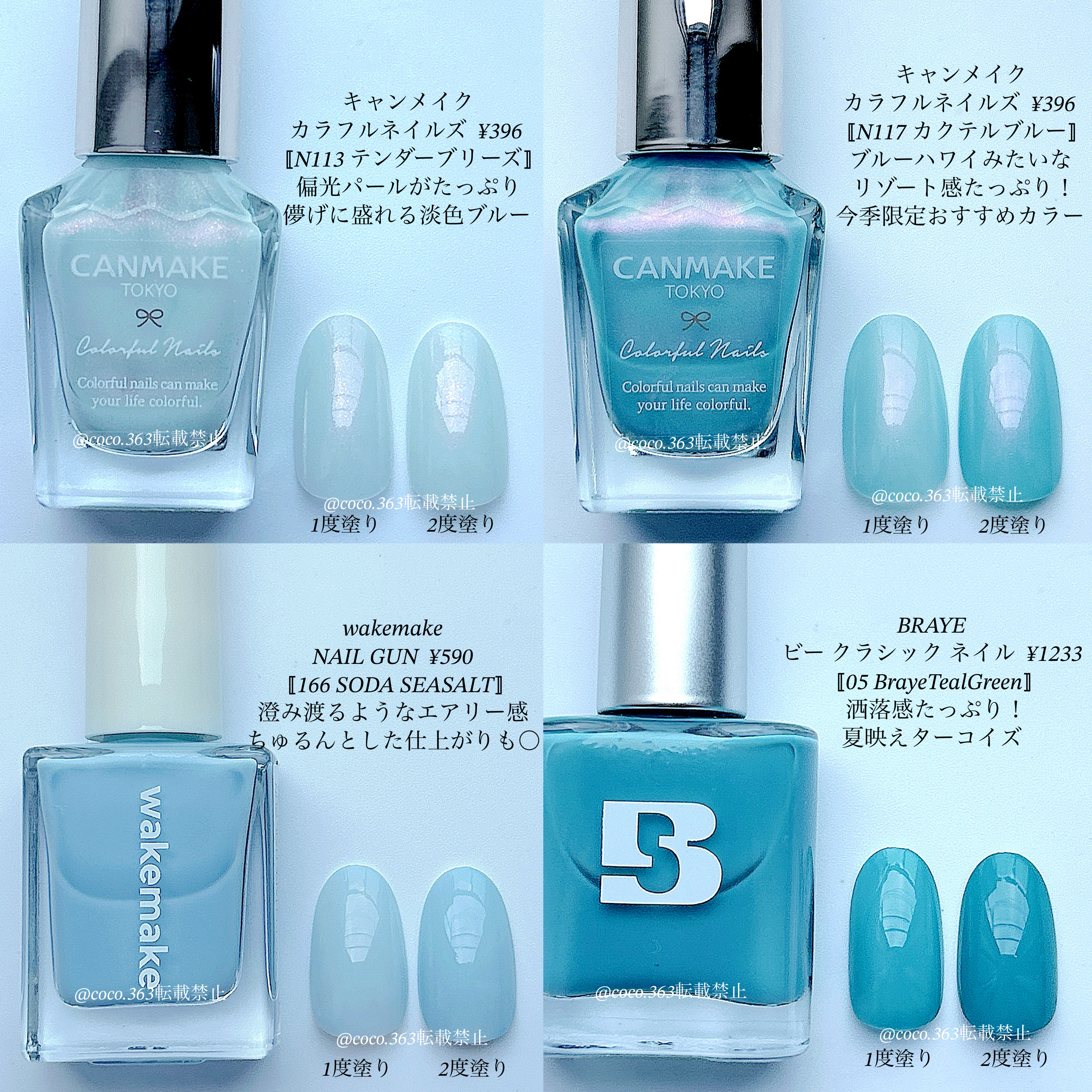 100均・プチプラ・韓コスでお洒落さんの爪先に💅🏻♡夏に纏いたいあか抜けブルー8選!︎︎︎︎︎︎☑︎詳細は2枚目からの画像でどうぞACネイルエナメル(セリアorキャンドゥ)¥110〚S028ホライゾンブルー〛※店舗により販売状況は異なりますTMネイルポリッシュ(キャンドゥ)¥110〚パールブルー〛※店舗により販売状況は異なりますネイルホリックくすみカラーズ¥396〚BL009K〛キャンメイクカラフルネイルズ¥396〚N82クラウドレススカイ〛〚N113テンダーブリーズ〛〚N117カクテルブルー〛wakemakeNAILGUN¥590〚166SODASEASALT〛・Qoo10公式にて購入BRAYEビークラシックネイル¥1233〚05BrayeTealGreen〛・Qoo10公式にて購入(価格は7月12日)どれもおすすめのカラーですがwakemakeの淡いブルーが可愛くて…可愛くて…🤦🏻♀️♡BRAYEのネイルメガ割で見つけて初購入✨塗りやすく仕上がりもよくパッケージもお洒落でこちらもおすすめ🙌🏻ネイルのまとめは↓↓↓からどうぞ!#coco100円ネイル#cocoNAILHOLIC#cocoキャンメイクネイル#100均#100均ネイル#キャンメイク#キャンメイクネイル#ネイルホリック#wakemake#BRAYE#夏ネイル#青ネイル#簡単ネイル#ちゅるんネイル#プチプラネイル#韓国ネイル#セルフネイル#ネイル#ポリッシュ#ネイルポリッシュ#マニキュア#selfnail#nail#美甲#네일#垢抜け#あか抜け#垢抜ける#垢抜ける方法#垢抜けアイテム#ドラコスこれ買って