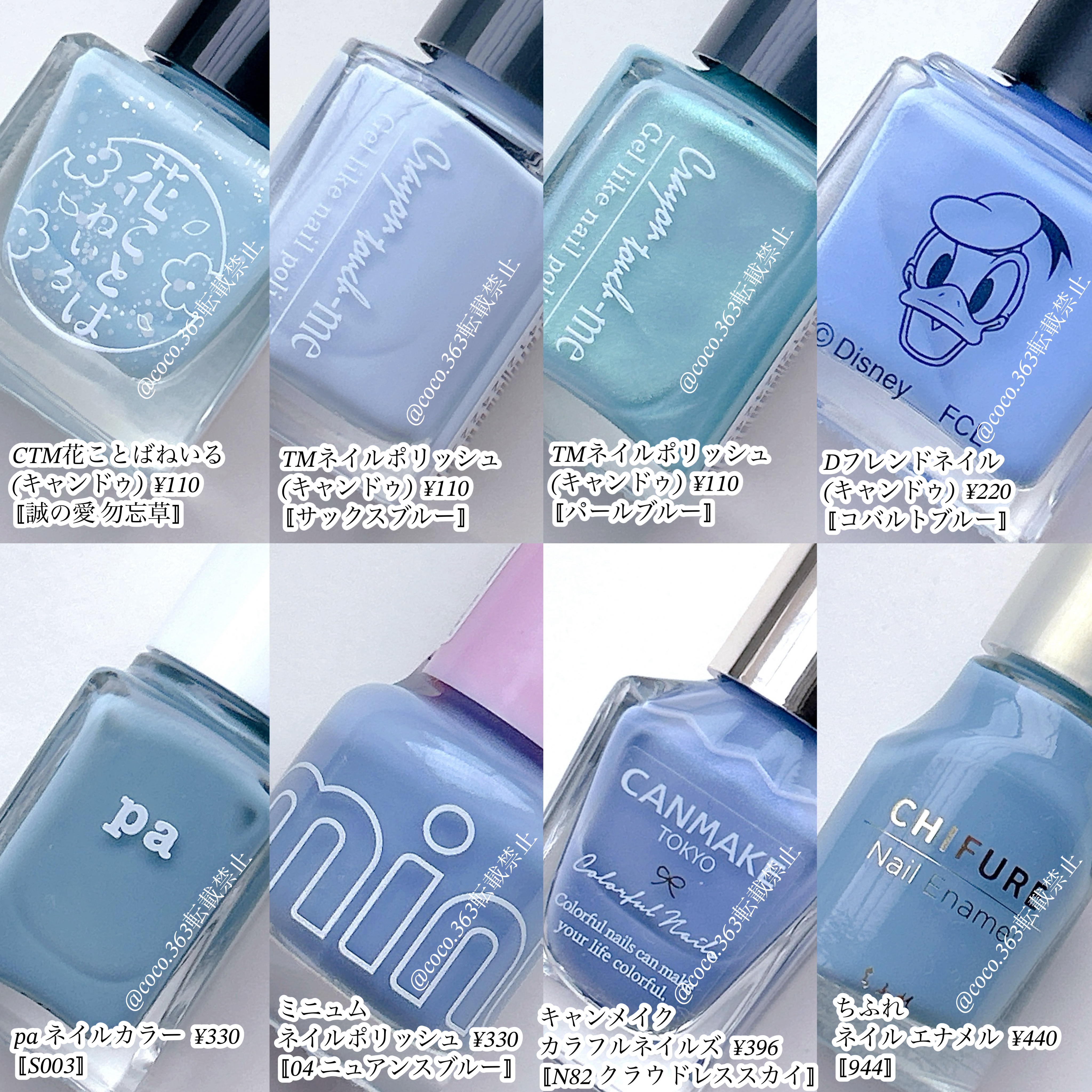 100均・プチプラマニキュアであか抜け🩵ニットに合わせたい淡色ブルーおすすめ8選💅🏻︎︎︎︎︎︎☑︎詳細は2枚目からの画像でどうぞCTM花ことばねいる(キャンドゥ)¥110〚誠の愛勿忘草〛TMネイルポリッシュ(キャンドゥ)¥110〚パールブルー〛〚サックスブルー〛Dフレンドネイル(キャンドゥ)¥220〚コバルトブルー〛paネイルカラー¥330〚S003〛ミニュムネイルポリッシュ¥330〚04ニュアンスブルー〛・クリエイトにて購入キャンメイクカラフルネイルズ¥396〚N82クラウドレススカイ〛ちふれネイルエナメル¥440〚944〛CTM花ことばねいるのシリーズ可愛すぎて最近お気に入り🥹♡定番ではなく売り切り商品なので気になる方はお早めにチェックしてね🙌🏻ネイルのまとめは↓↓↓からどうぞ♥#coco100円ネイル#cocopaネイル#cocoキャンメイクネイル#cocoちふれネイル#キャンドゥ#100均ネイル#paネイル#キャンメイクネイル#キャンメイク#ちふれネイル#ミニュムネイルポリッシュ#秋ネイル#青ネイル#ちゅるんネイル#簡単ネイル#プチプラネイル#セルフネイル#ネイル#ポリッシュ#ネイルポリッシュ#マニキュア#selfnail#nail#美甲#네일#垢抜け#あか抜け#垢抜ける#垢抜ける方法#垢抜けアイテム#秋の先取りコスメ