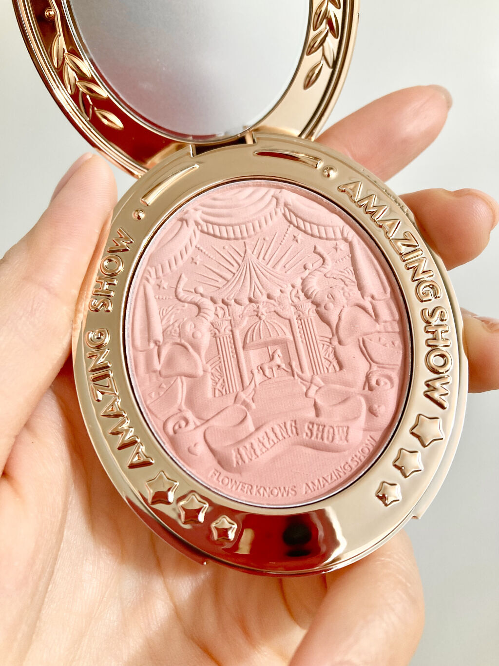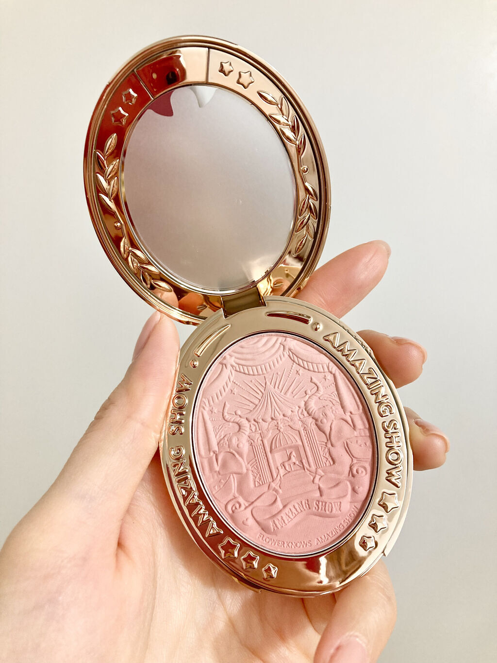 めちゃくちゃめちゃくちゃ大好きなフラワーノーズ 💕 まずパケがかわいい!魔法少女に変身できそうな気がします😍 大きさは手のひらに乗るサイズ、フタはマグネットで開けやすく、中にはミラー付きです! チークの型押しがサーカスの様子なのですが、彫刻!?と思うぐらい素敵で見惚れてしまって、使うのがもったいないぐらいです!!