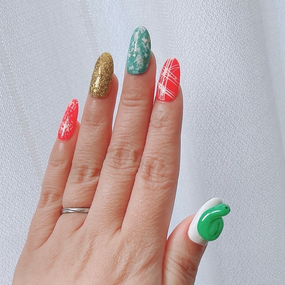 2025🐍あけおめことよろ✨#お正月ネイル今年は親指にヘビを作ってみました。粘度ジェルで形作って、グリーンで着色してます。そのほかの指はお正月風に。ネイルチップつけるのに時間がかかって、トータル2時間くらいかかってしまいました。イマイチなライトしか手元になく、今年はライトを新調しようと思います。✨irogelピールオフベースジェル✨キャンドゥ パルプレミアムポリネイルジェルクリア✨キャンドゥパルプレミアム粘土ジェルクリア✨GRANJEベースジェル✨セリアSHジェルネイルトップコートノンワイプ✨セリアSHジェルネイルラメコートノンワイプ✨キャンドゥ パルカラージェル ホワイト✨キャンドゥ パルカラージェルポピーレッド✨キャンドゥ パルカラージェルライトシーグリーン✨セリアSHジェルネイルブラック✨セリアSDジェルネイルピュアグリーン✨セリアSDジェルネイルブロッサムピンク✨セリアSBジェルネイルドローイングジェルホワイト✨ホイル ゴールド✨ラメ ゴールド#セルフネイル#fukafukanail#nail#nails#ポップandガーリーネイルが好き#プチプラネイル#100均ネイル#100均ジェルネイル#ジェルネイル#セルフジェルネイル