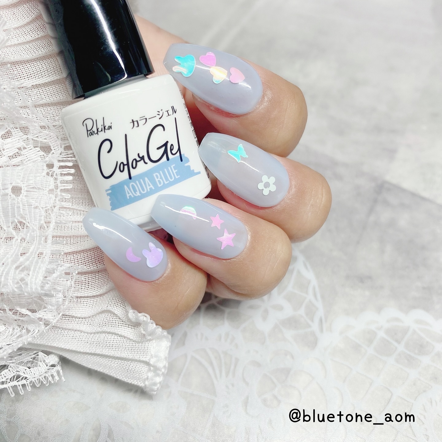 柔らかな発色のベイビーブルー🩵 黄色味の少ない少しだけ紫寄りのベビーグッズにありそうなとっても可愛い水色! 単色塗りも可愛いし、 写真はオーロラパウダーを重ねてみたり シルバー系との相性も👍 マットトップコートとの相性もすりガラスみたいになって本当にかわいい! マットトップコートはダイソーの使いました 寒色系使いたいけど慣れないって人にもおすすめの肌馴染みよい水色でした🩵 ひとつ持ってたら色々活躍します🩵