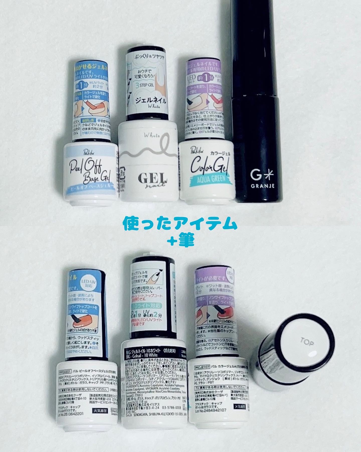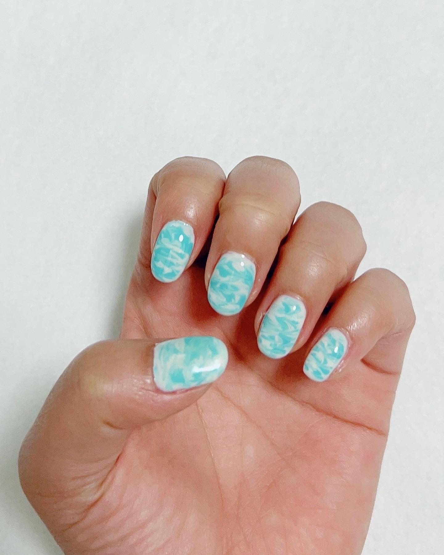 夏らしいカラーでマーブルネイルにしました。 かわいい仕上がりに大満足です! ホワイト2度塗り目にアクアグリーンを足して、筆で混ぜてマーブルにしてから硬化しました。 1本ずつやったので、ペンタイプのLEDライトを使いましたよ。 トップジェル以外は100均で買えるものを使いました。 キャンドゥのピールオフを使ったら、思っていたより早く外れてしまいました。 薄く塗る程度で良いのかも? 爪へのダメージほぼ無いのが良いところではありますが。 さすがに当日に取れてしまうのは早すぎるので、数日持つ塗り方を研究したいです。