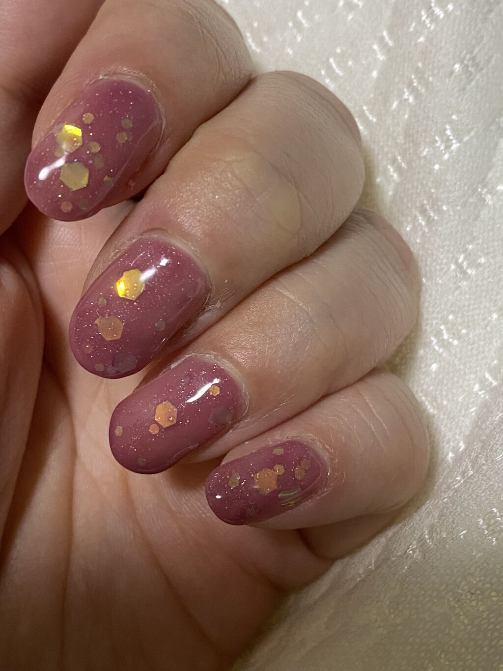 .セリアの商品ジェルネイルラメプラムピンクよくセリアのジェルネイルを買うのですが、この色味がお気に入り◎落ち着いた色でもあり、少し派手さも演出できるネイルの色味です◎