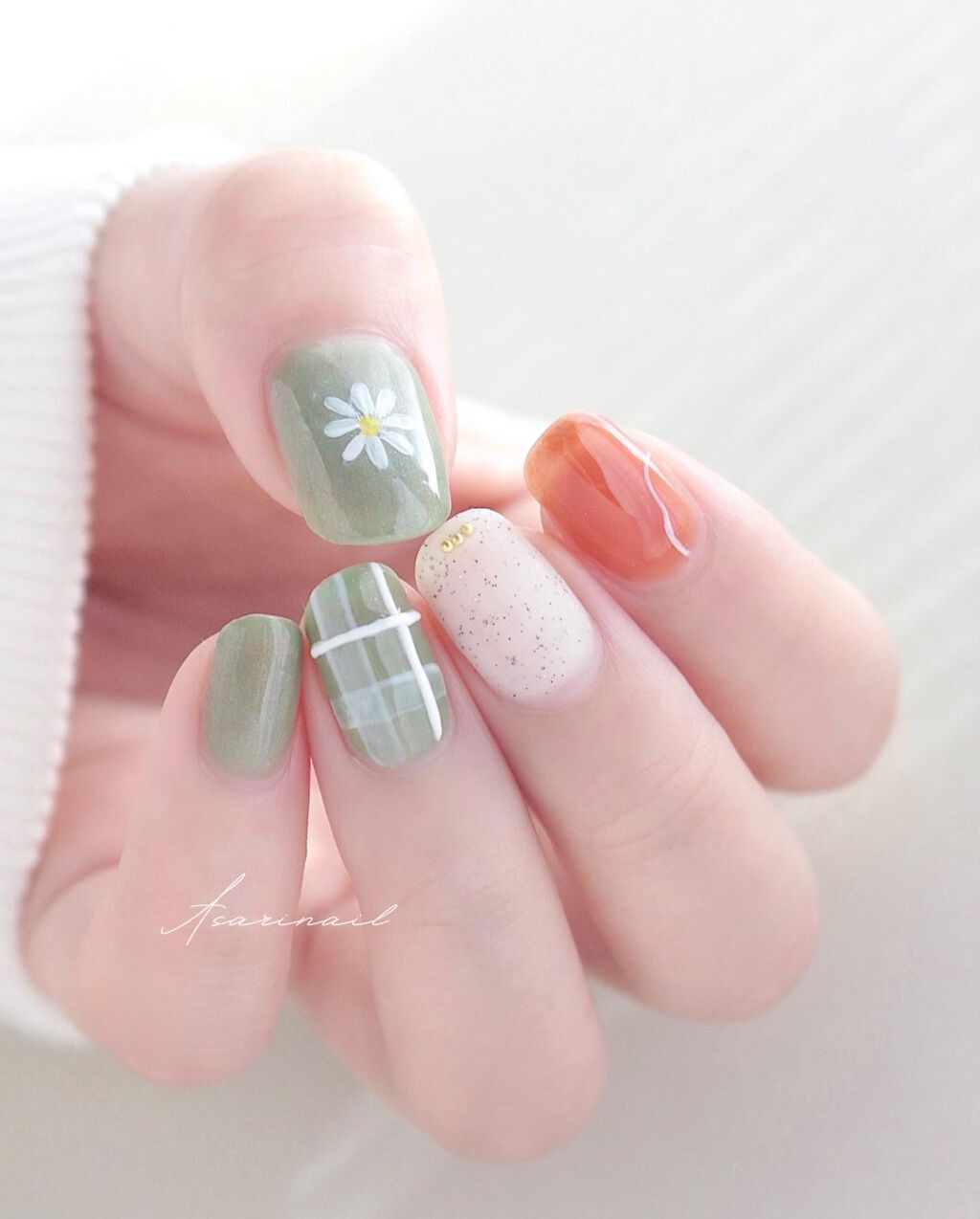 𓂅𓂅ɢʀᴇᴇɴ☘️🌼4月の終わり頃に塗ってたネイルなので春感つよめです☺️𓂃𖥣𖥣𖥣ちょっぴり個性派な黄緑につやんとオレンジブラウンˊ˗黄緑は色んなのを混ぜて作ったので使用カラーに載せなかったんですが、ウィークリージェルのNE-L1をメインに混ぜまぜしました そしてずっと挑戦してみたかった手描きマーガレット!🌼遠目で見ればそれっぽいけどなかなかに雑で…(お蔵入りにしようかと思った🥺)お花はネイル工房さんの筆で描きました⸝⋆⸝⋆ ┈┈┈┈┈┈┈┈┈┈┈┈┈┈┈┈┈𖥧𖤣使用カラーHOMEIウィークリージェルネイルタウン▷品番は写真の最後に┈┈┈┈┈┈┈┈┈┈┈┈┈┈┈┈┈ #ショートネイル#セルフジェルネイル#ウィークリージェル#homei#セルフネイル初心者#春ネイルデザイン#グリーンネイル#マーガレットネイル#チェックネイル