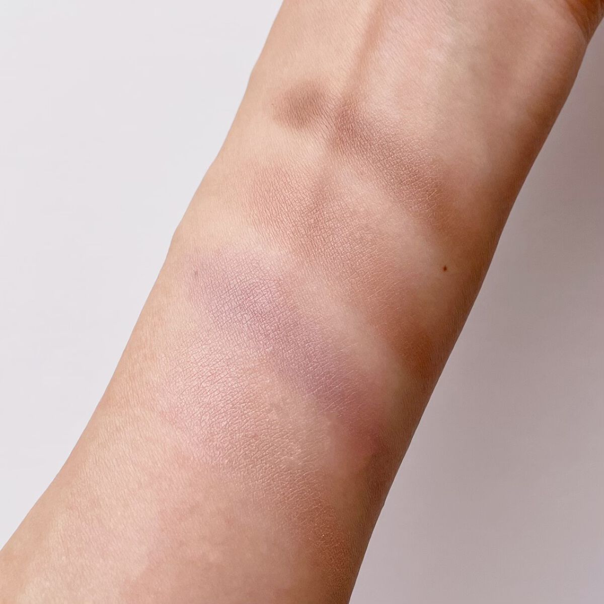 粉質は柔らかくしっとりめで発色も良い🙌 ピンクと言うよりパープル感が強いかな。 でもパープル過ぎる事もなく絶妙でとっても可愛い💜 明るめのピンクブラウンだけど青みが強いので髪色に左右されず、使い易く結構気に入っていて、限定色なのでストック買いました🤣笑 ふんわりして馴染みやすい色なので秋冬にも良さそう😍🍁