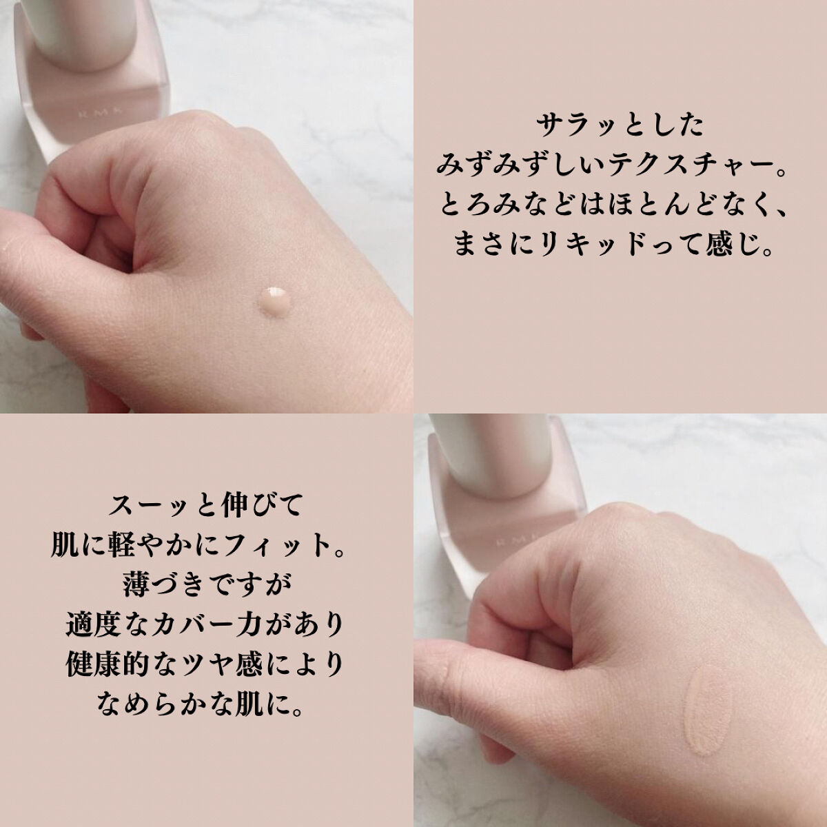 \RMKのファンデーションを比較してみた/RMKのファンデーションを3種類使い分けているのですが、それぞれの特徴や使用感をまとめてみました✨ちなみにどのタイプも明るめのピンク系201番を使っています♡【クリーミィファンデーションEX】一番最初に買ったRMKのファンデーション。しっとりとした使用感で保湿力高めなので秋冬メインで使っています。3タイプとも同じ色番ですが、これが一番明るく透明感のある肌に仕上がります。【リクイドファンデーション】春になってクリーミィファンデーションEXが少し重く感じたので春夏用に購入したファンデーション。(軽い使用感が好きで秋冬も使っています。)水のようにサラッとしたテクスチャーで軽やかに肌に伸び広がり、みずみずしい使用感です。3タイプの中で一番ナチュラルで健康的なツヤ肌に仕上がります。【リクイドファンデーションフローレスカバレッジ】昨年発売したファンデーション。カバー力と透明感を兼ね備えていて、気になる部分はしっかりカバーするのに素肌感のあるツヤ肌に仕上がります。「RMKのファンデはカバー力が…。」と思っている方にぜひ使っていただきたい!まさに三者三様って感じで3つともそれぞれ使用感が良く、どれが一番おすすめとは言えません!もし、可能であれば3タイプ購入して肌の調子やなりたい肌によって使い分けていただきたいくらい全部おすすめ。ちなみにどれも伸びが良いので少量で顔全体に使えるからコスパも◎。RMKのファンデーション欲しいけどどれがいいか悩んでいる方のお役に立てますように˚✧パウダーファンデを追加したものもあるので、よければそちらもご覧くださいませ❤️https://lipscosme.com/posts/5314816ご覧いただきありがとうございました💐#RMK#rmk_ファンデーション#クリーミィファンデーションEX#リクイドファンデーション#リクイドファンデーション_フローレスカバレッジ#リキッドファンデーション#クリームファンデーション#ファンデーション_デパコス#ファンデーション_おすすめ#ファンデーション_ツヤ#ファンデーション_比較#本音レポ