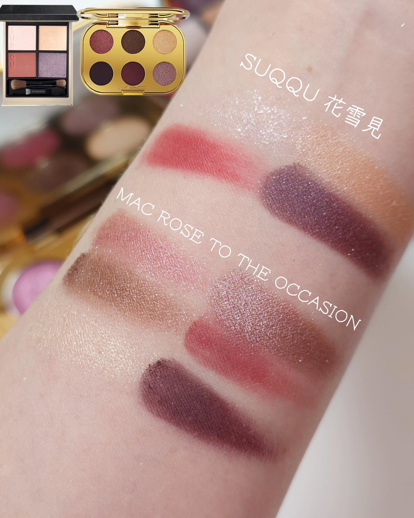 花雪見の左上カラーはめちゃくちゃ透明感も出るし大きめなラメも混じっていてキラキラ可愛いんです🤤💕 大きめラメでも全然下品じゃなくむしろ上品なのは流石SUQQUです✨ 左下のレッドも赤すぎず使いやすい!血色感も与えてくれるし左上カラーを重ねるとピンクっぽい色味に…♡ こちらを使用するともれなく盛れるので好きです♥️ 去年の手持ちのクリスマスコフレで買ってよかったNo.1かもしれません✨✨