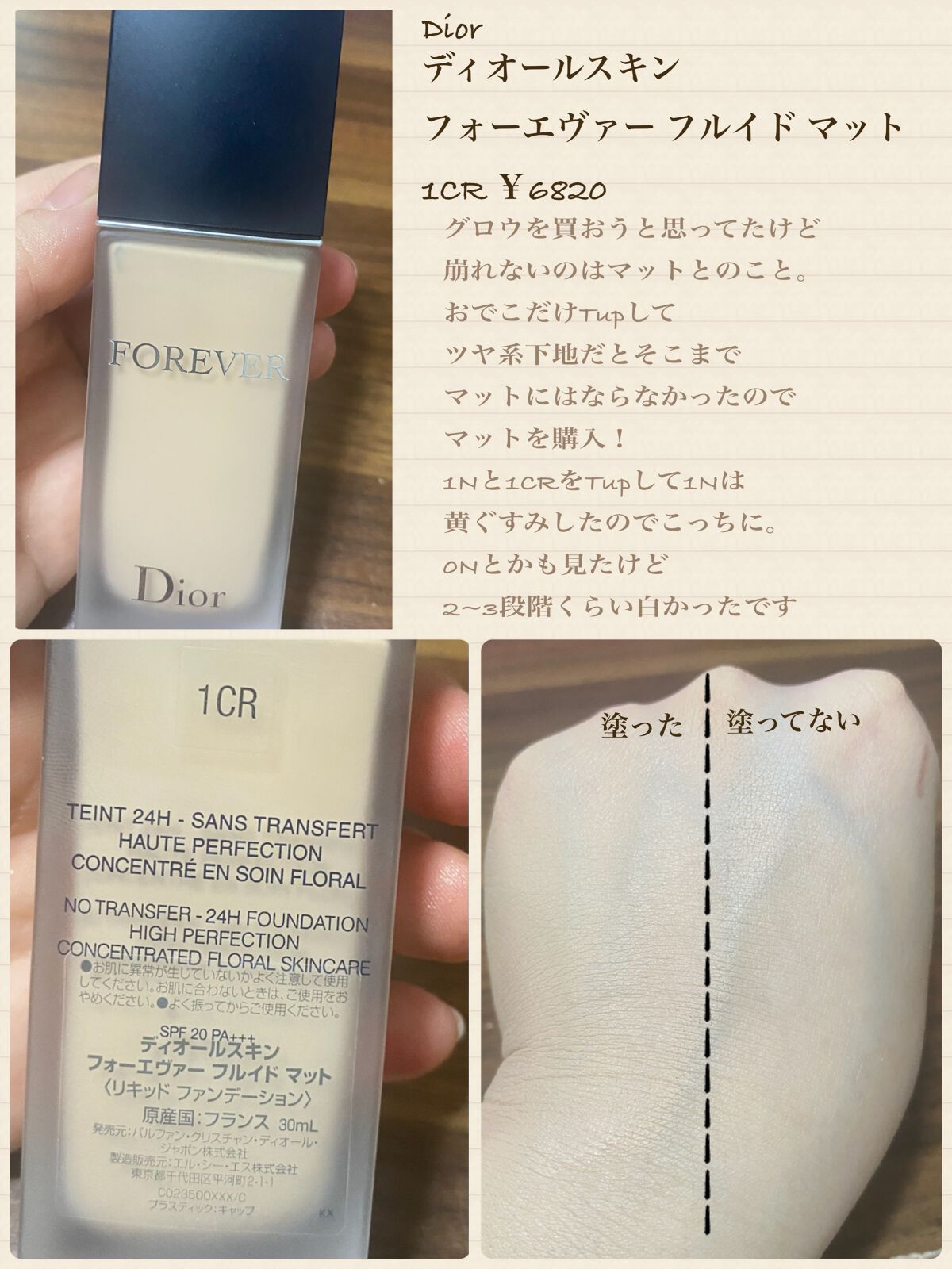 こんにちは🌞こんばんは🌝ちむです🎈今回紹介する商品は汗・蒸れ・崩れ・テカリに強く、色ムラ・毛穴などの気になる部分をカバーしてくれる最強のリキッドファンデーションです💖💖みなさんの参考になれば嬉しいのでよかったら見ていって下さい🔜🫱🏻🫲🏼ではさっそく紹介していきマス❣️📍使った商品→Dior:ディオールスキンフォーエバーフルイドマット(1CR-クールロージー)📍SPF20・PA+++📍色展開が11色📍ピンクよりのトーン:クールロージー(CR)→0CR・1CRの2色🔆📍ニュートラルなトーン:ニュートラル(N)→0N・1N・1.5N・2N・3Nの5色🔆📍黄みよりのトーン:ウォーム(W)→0W・1W・2Wの3色🔆📛崩れにくさ→マットなので当たり前に崩れにくい✔️(笑)→フェイスパウダーを上に付けるとより崩れにくくなる✔️📛カバー力→キルカバーのリキッドファンデとかに比べるとカバー力はそんなに高くはない✔️→だけど程よくカバーしてくれて元から肌が綺麗な人みたいになれる✔️→色ムラ・毛穴・小鼻の赤みなどはカバーされる✔️📛ツヤorマット→5枚目の写真を見てもらえればわかる通り、マットなんだけど少しツヤがある✔️📛密着力→液自体が少し重ために作られているから密着力高め✔️→肌にピタッとくっついてくれる✔️📛感想→テクスチャーは少し重め✔️→ロングラスティング処方になっているのでめためた崩れに強い✔️→BAさんに聞いたところこのファンデはグロウタイプの方が人気らしい✔️(笑)→普段上からフェイスパウダーをゴリゴリのせちゃう人はマットでいいと思う✔️(私の事)→ツヤが欲しい人はグロウタイプのリキッドファンデの方がオススメ✔️→マットでも自然なツヤ感が出てくれるからめちゃくちゃ綺麗✔️→SPFが20なのが少し残念✔️→普段ニュートラルで標準色よりワントーン明るい色を買っていたんだけど、BAさんに相談したら1CRをオススメされてタッチアップして貰ったらめちゃくちゃ肌に馴染んで血色感が出たから1CRにした✔️→ネットで買うと色味を選ぶのが難しいから直接店舗に行ってBAさんに相談するのがいいと思う✔️→パケもかわいいし大優勝✔️💫→このファンデのコンセプトでもある汗・蒸れ・崩れ・テカリ、この4つにとても強い✔️→マットが好きだけど厚塗りは嫌!だけど色ムラや毛穴、小鼻の赤みはカバーしたい!って人にオススメ✔️🌟🌟🌟🌟以上で私的最強リキッドファンデの紹介は終わりです😻フォロバするのでよかったらいいねとフォローお願いします🤙🏽❤️🔥#dior#ディオールスキン_フォーエヴァー_フルイド_マット#1CRクールロージー#リキッドファンデーション#dior_ファンデーション#夏コスメの戦利品#さよならコンプレックス#天然美少女メイク#衝動買いコスメ